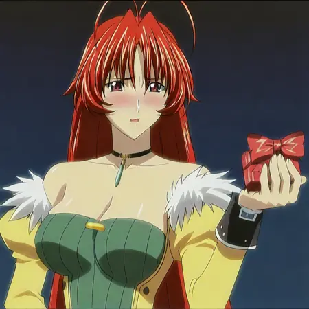 satella harvenheit \(chrono crusade\), red hair, long hair, antenna hair, bangs, hairbow, red eyes, choker, necklace, jewelry, green and yellow dress, fur trim, detached sleeves, pantyhose, heels, cleavage, large breasts, 1girl, solo