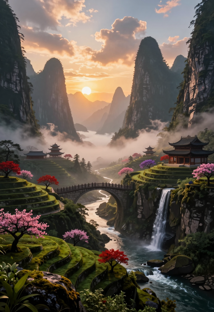 このスタイルは、絵画的リアリズムと柔らかな大気的グラデーションを融合させ、山々、砂漠、川、神聖な建築を時間の印象へと変えていきます。ディテールは控えめで、筆触的かつ詩的です:エッジは霧に消え、反射は墨のように優しく広がり、すべてのシーンは純粋な静けさの瞬間のように感じられます。