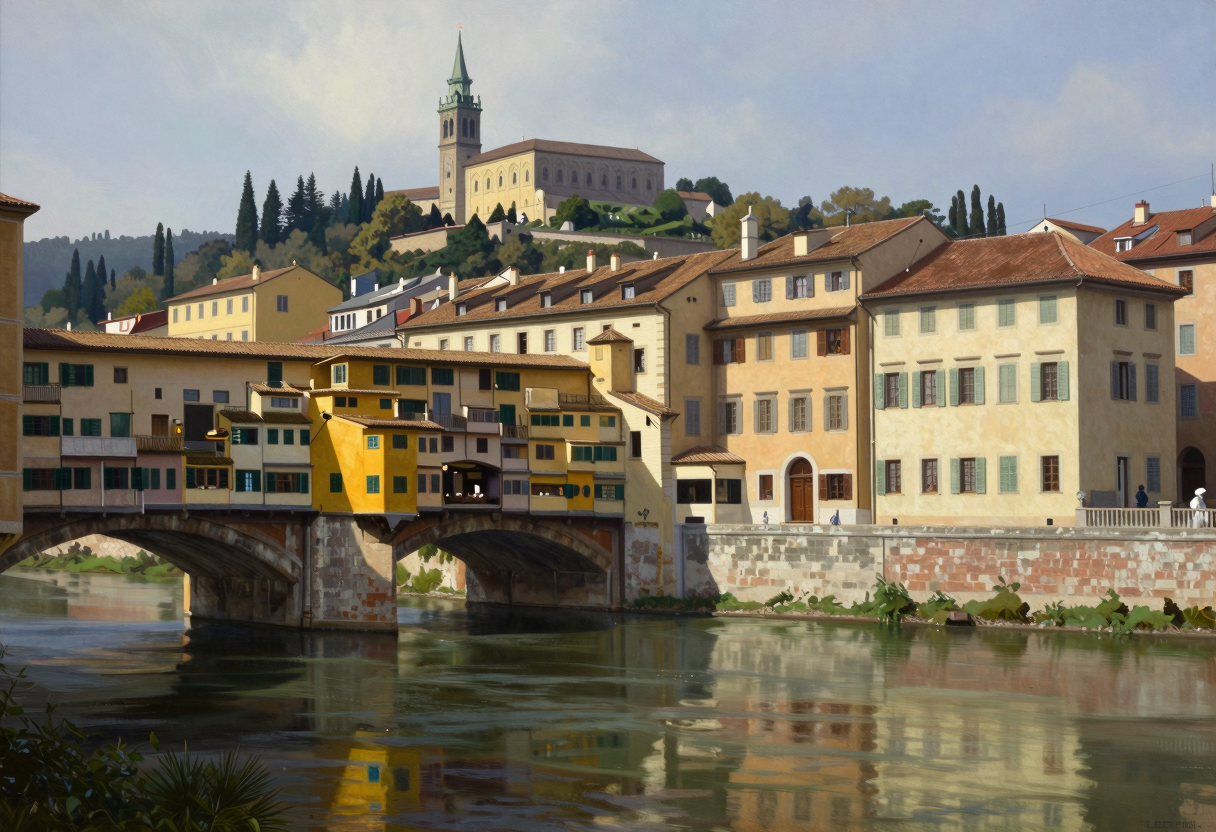 柔らかな絵画的リアリズム、大気的風景、古代の幾何学、水彩シェーディング、霧の奥行き、暗闇の中の明るさ、柔らかさの中の明るさ、詩的な世界遺産のムード、静かな水平線のグラデーション