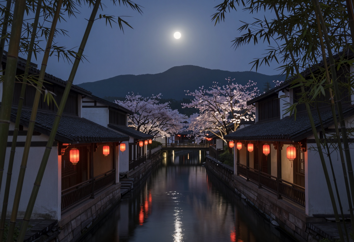夜のランドマーク:月の銀色の輪郭、墨の鏡のような水