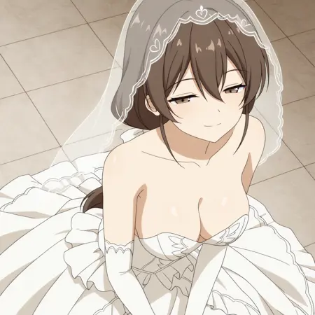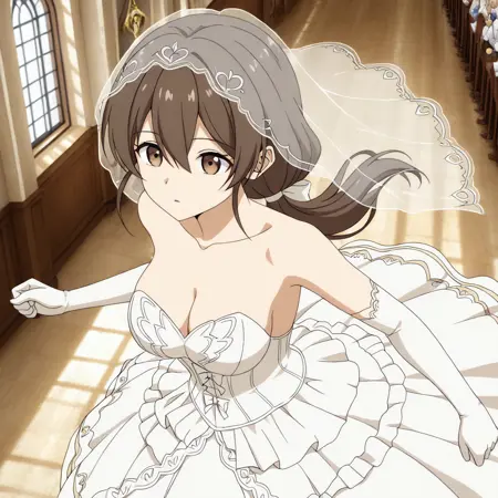 ウェディングドレス:(AriaWedding, 白い髪リボン, 白いストラップレスウェディングドレス, コルセットの紐, 長いドレス, ブライダルグローブ, 肘までグローブ, (短いブライダルベール), (リボントレイン))