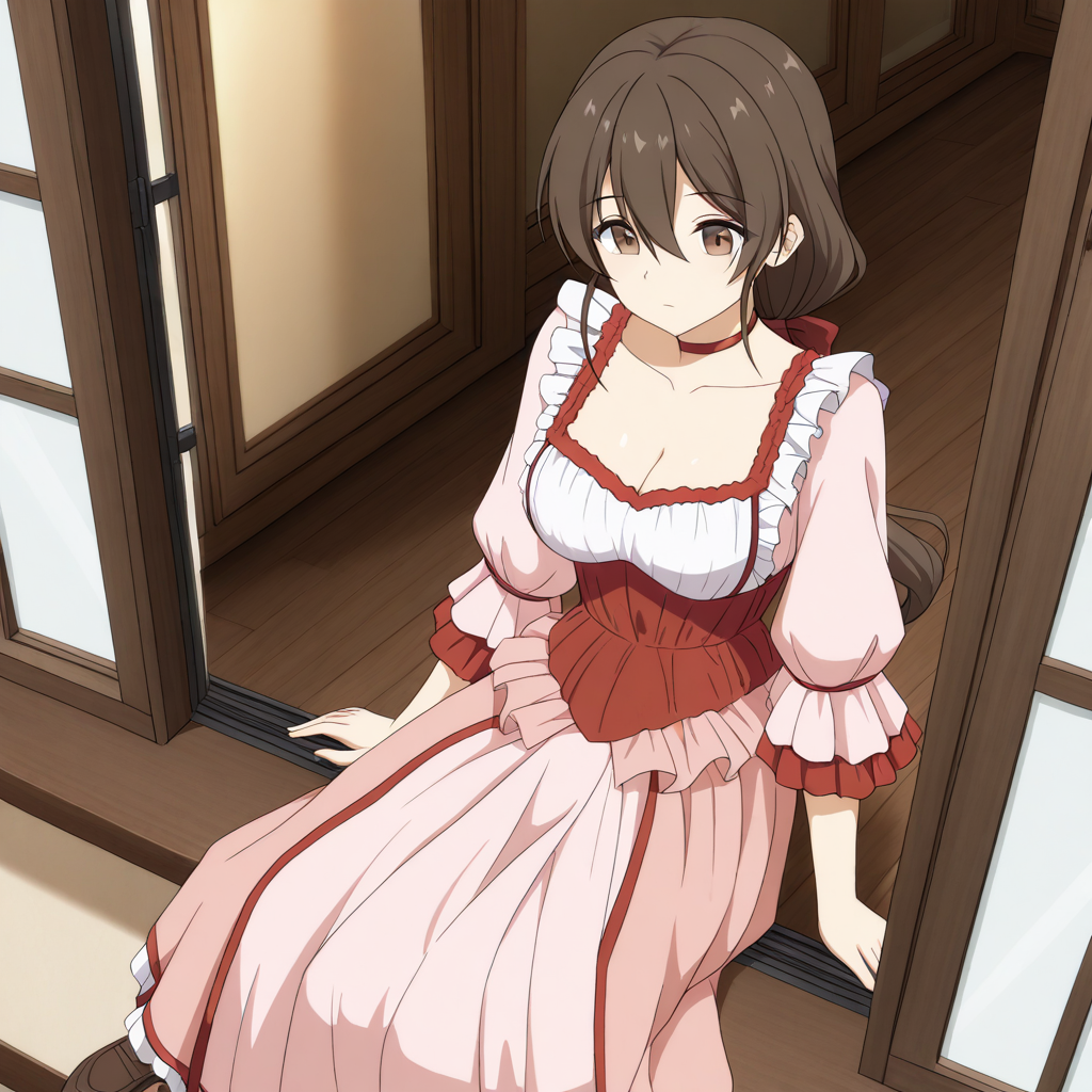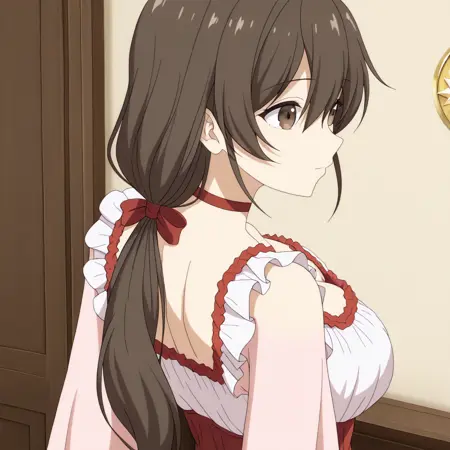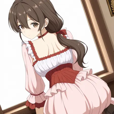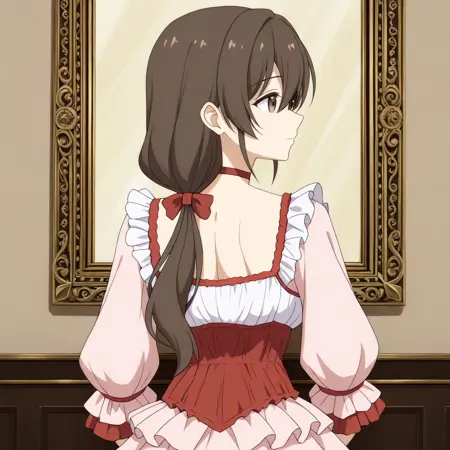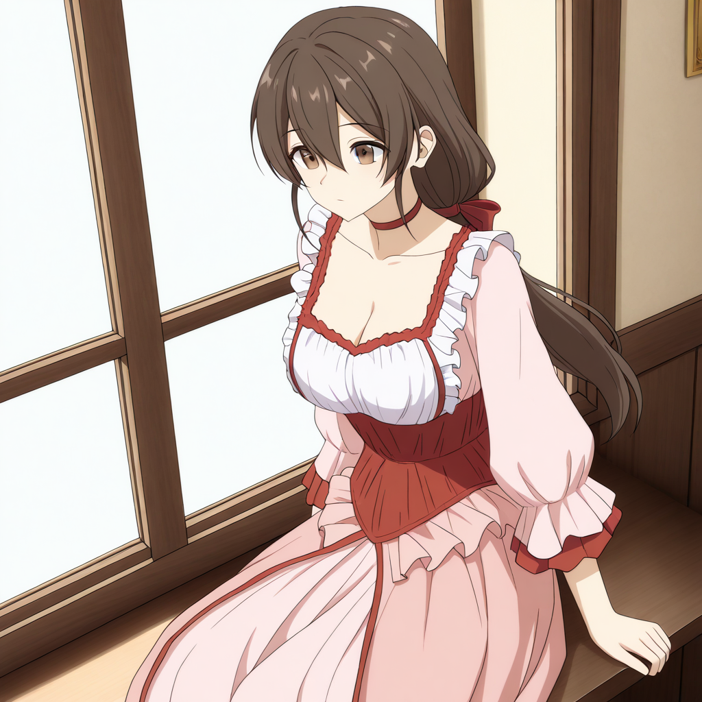 ピンクのドレス:(AriaBase, 赤いチョーカー, 赤い髪リボン, ピンクのドレス, 白い胸元, 赤いアンダーバストコルセット, フリル, 胸元)