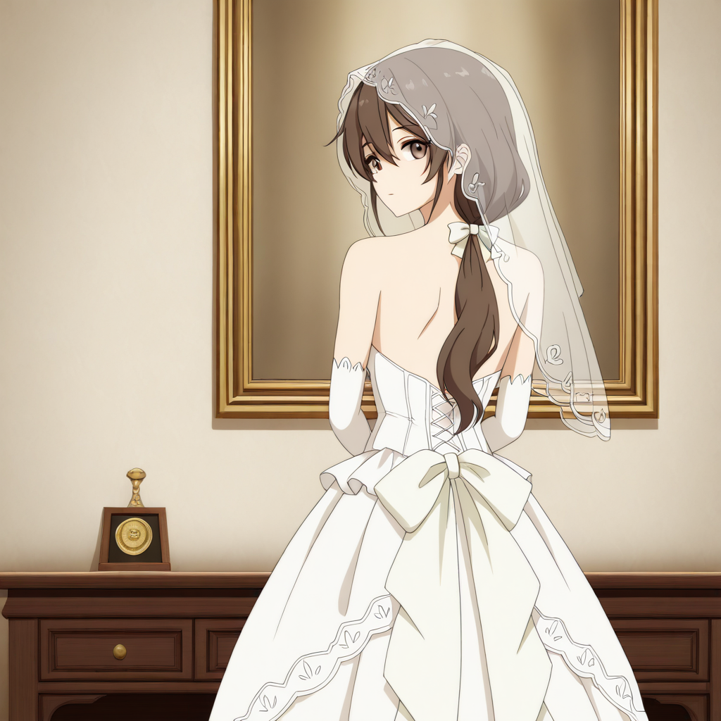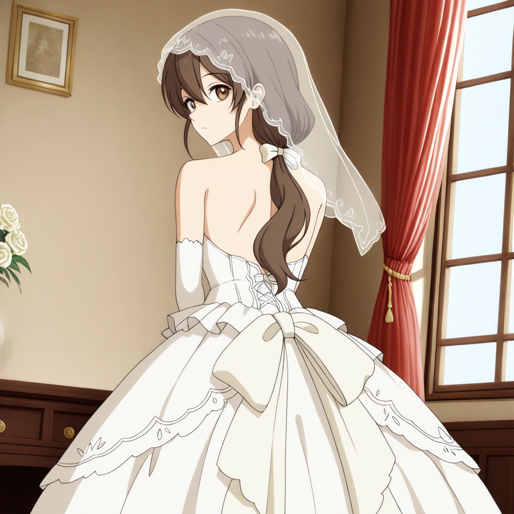• ウェディングドレスの背面のリボントレインは、必ずしもフルサイズで表示されない。