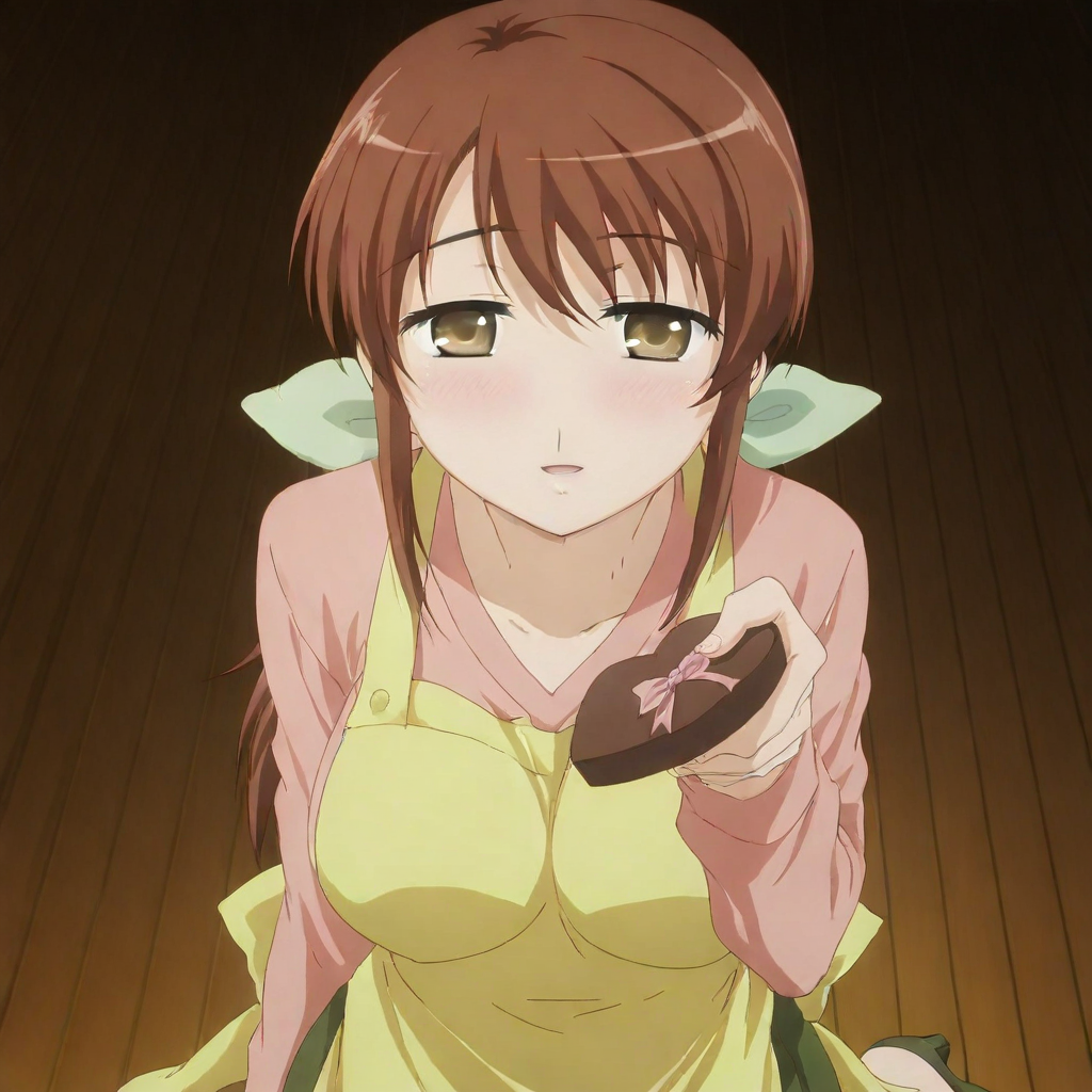 chigusa sakai \(dark brown hair, medium hair, ponytail, hairbow, bangs, sidelocks, brown eyes, yellow apron, pink undershirt, skirt, heels, large breasts, 1girl, solo
