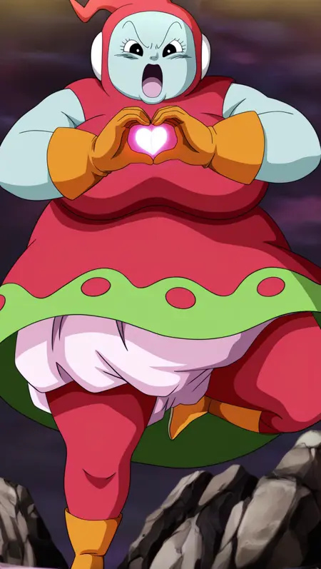 g14nt f0rm, 黒い目, 白い瞳, 赤と緑のジャケット, 紫のアンダーシャツ, ピンクのブルマー, 赤いパンティーストッキング, ハート型のベルト, ピンクの翼, フード, オレンジのブーツ, オレンジの手袋, 青い肌, 巨大な女性, 巨大な胸, 肥満,