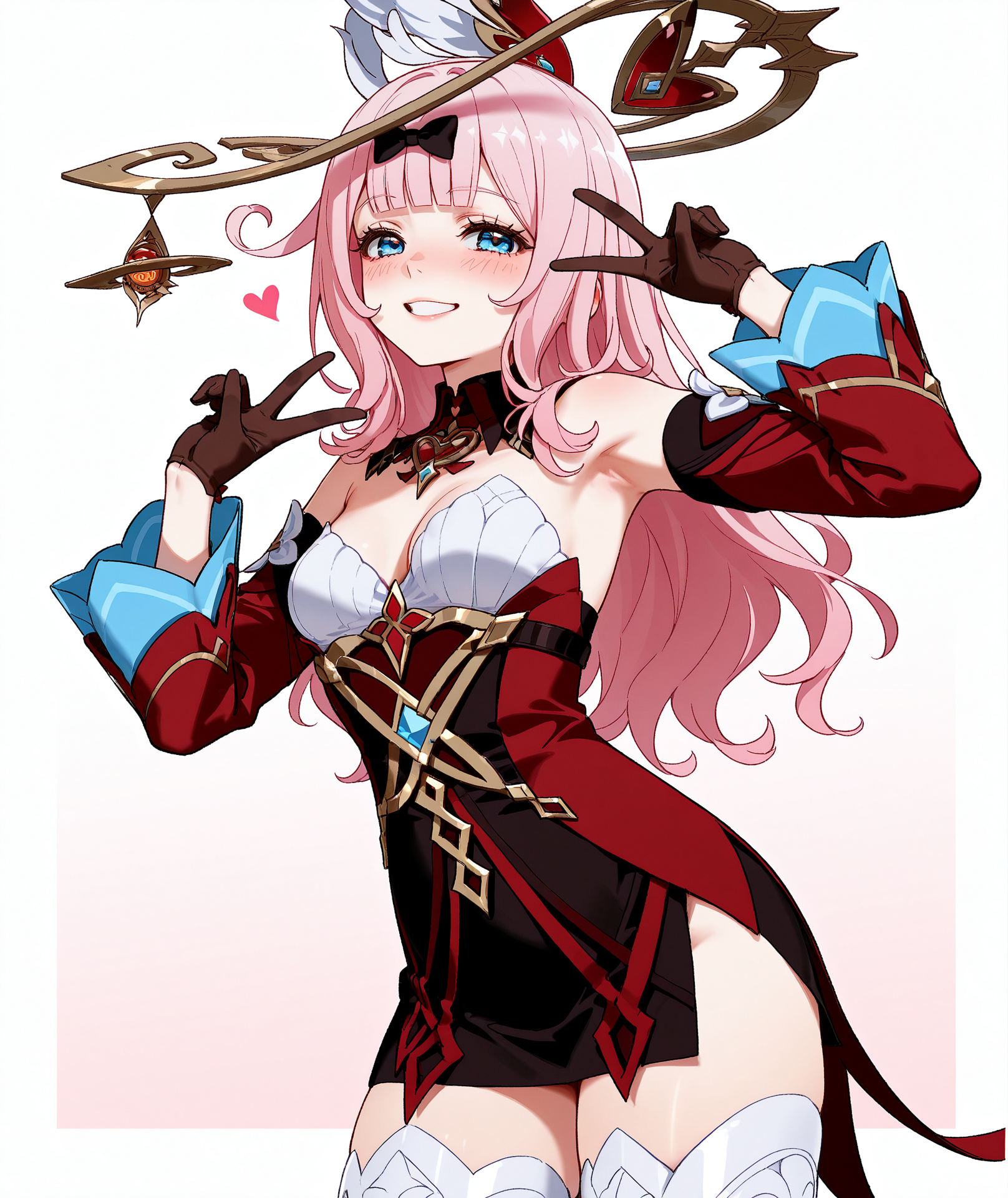 長い袖、手袋、ドレス、外れた袖、黒い手袋、広い袖、外れたカラー、ハーフグローブ、短いドレス、宝石、ストラップレスドレス、茶色の手袋、赤いドレス、赤いリボン、リボン、黒いドレス、