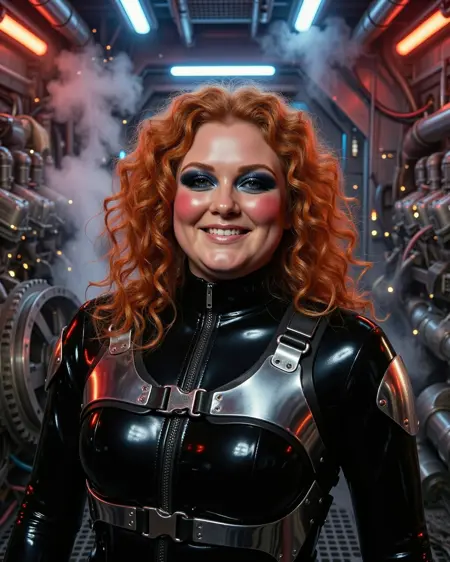 2089, petite Japanese girl with jet-black bob in glossy black latex work suit, sleeves rolled, grease streaks on cheeks, welding torch in hand repairing a humming starship thruster in a cavernous orbital drydock, sparks raining down, cyan work-lights cutting through orange plasma haze