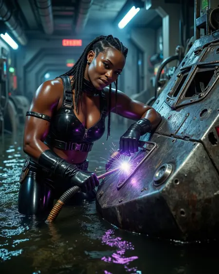 2089, petite Japanese girl with black bob in glossy latex work suit, welding a starship thruster in orbital drydock, sparks and orange haze