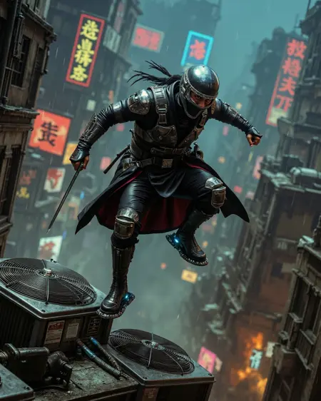 This trigger word gives your images a unique atmosphere: crisp cinematic teal-orange grading, rain-slick streets and gleaming chrome, towering cityscapes lost in dense fog, flickering neon signs, hovering vehicles with soft thruster glow, sleek latex outfits, poised cyber-ninjas, and a moody retrofuture tension.