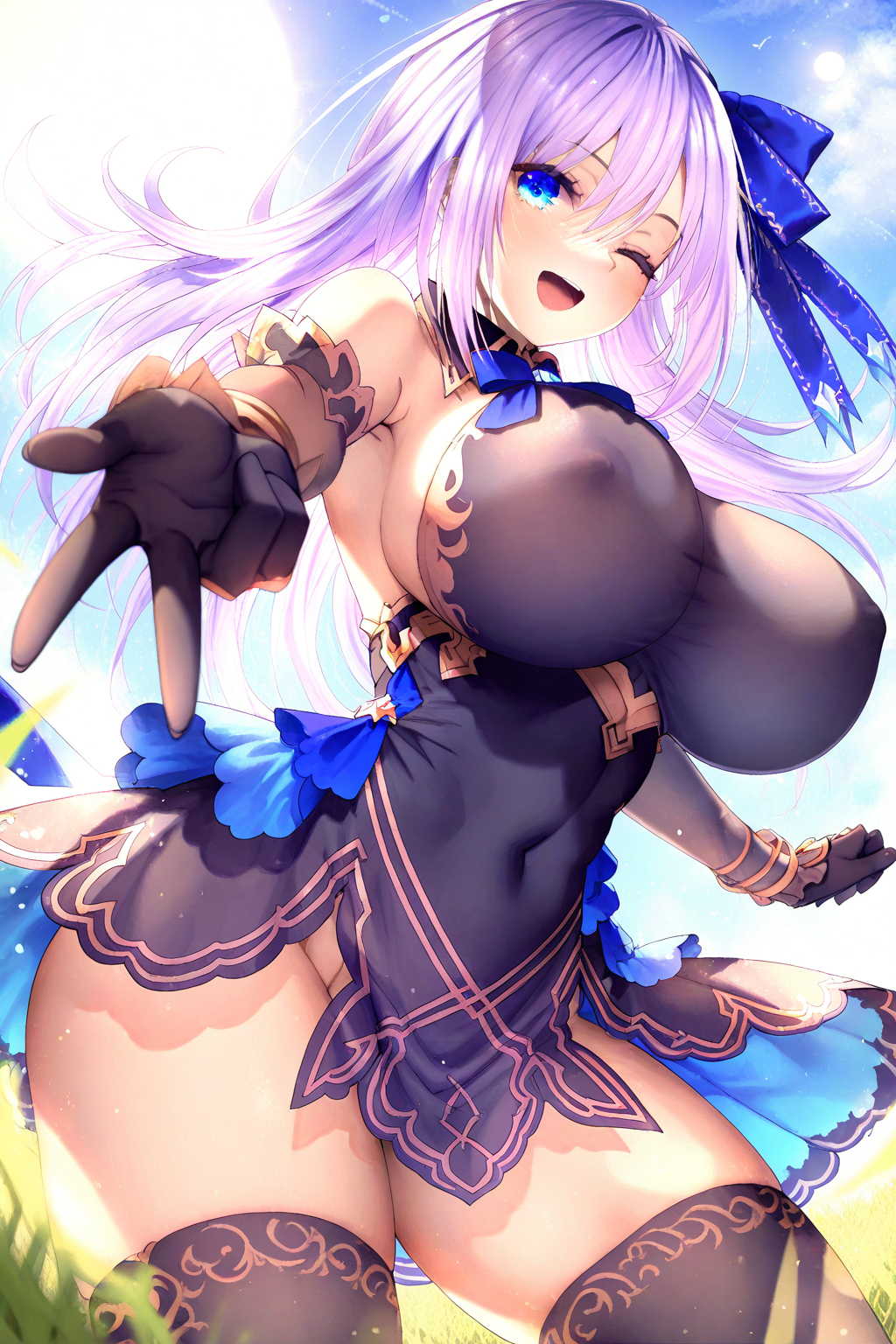 ectisdef, 1girl, solo, blue eyes, long hair, purple hair, large breasts, bare shoulders, ectisdef black and blue dress, ectisdef blue bow, ectisdef blue braid, covered navel, ectisdef white thighhighs, ectisdef black elbow gloves,