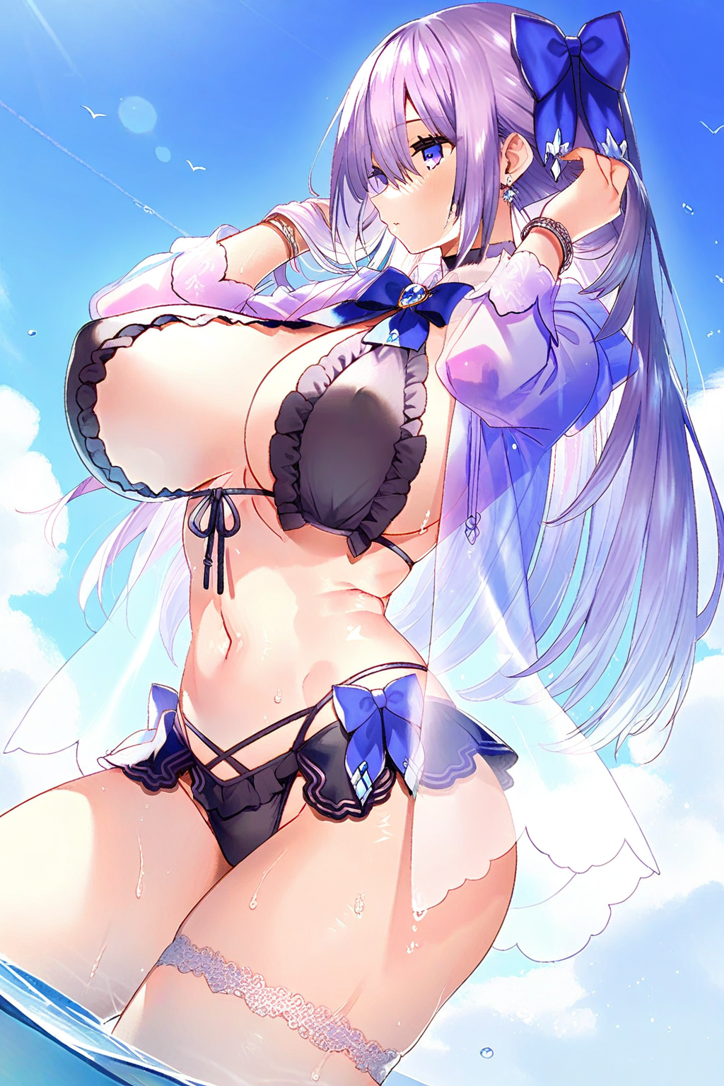1girl, solo, purple eyes, long hair, purple hair, large breasts, ectisswm black frilled bikini, ectisswm black front-tie top, ectisswm blue choker, ectisswm blue bow, ectisswm blue hair bow, jewelry, navel, ectisswm blue see-through jacket, ectisswm white thigh strap, open jacket, cleavage,