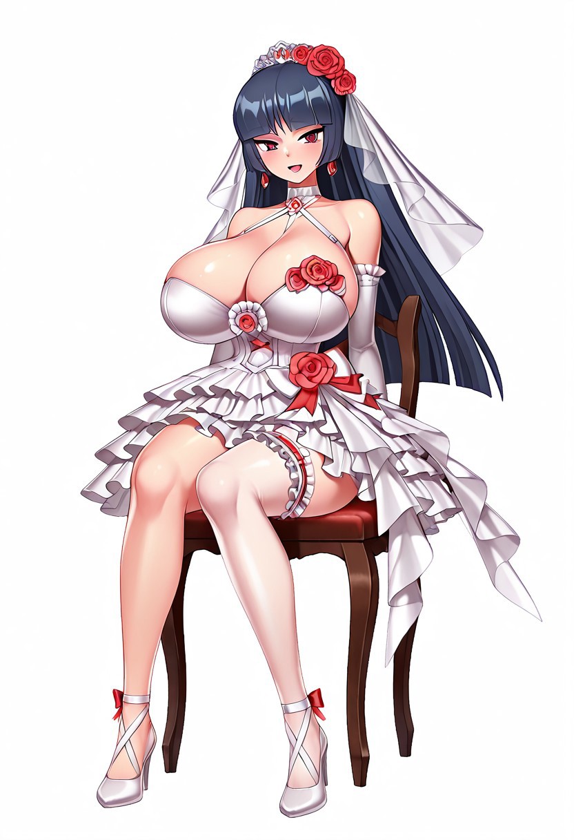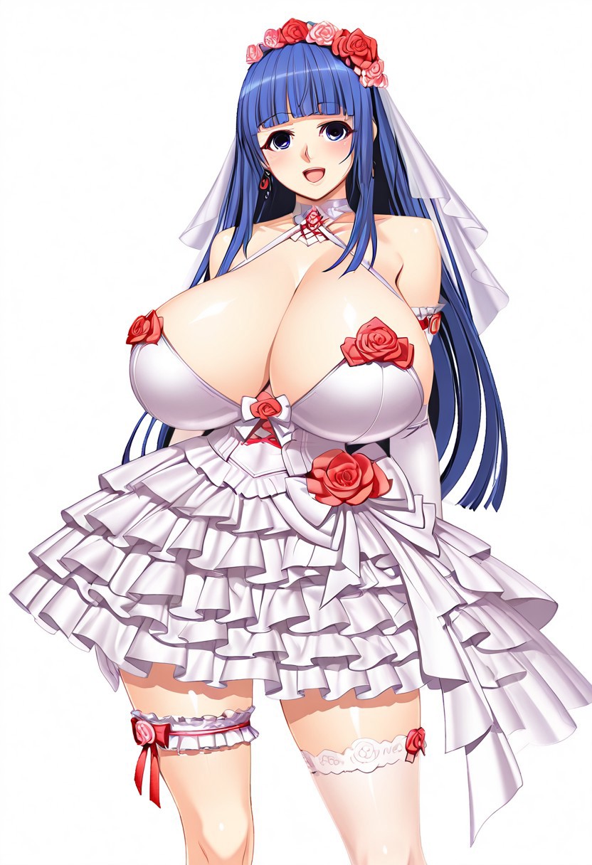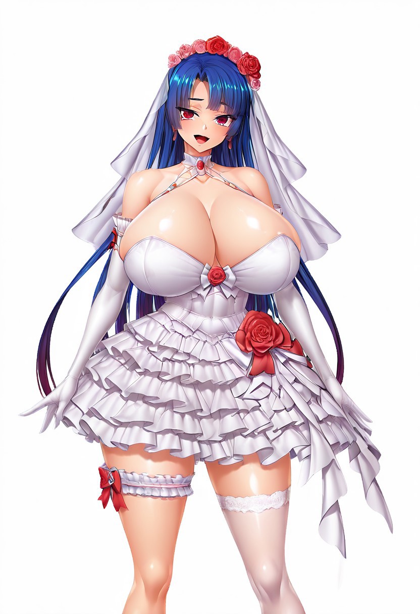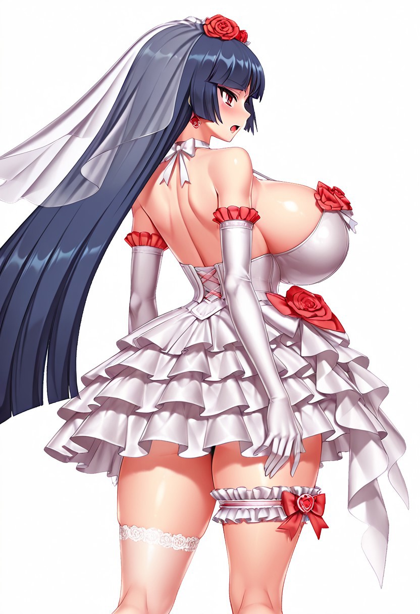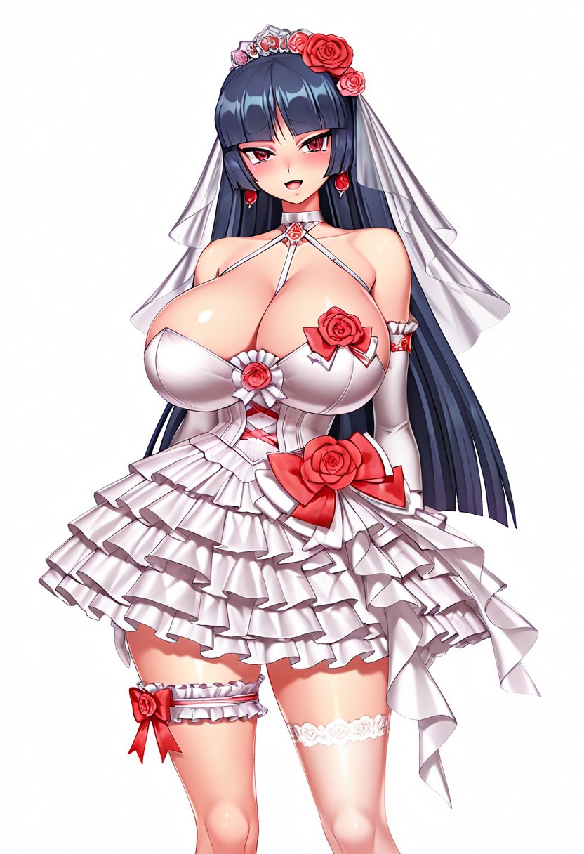 태그: 유니브라이드 야쓰, 웨딩드레스, 어깨 노출, 흰 드레스, 베일, 머리 꽃, 팔꿈치 장갑, 귀걸이, 프릴, 한쪽 허벅지 양말, 신부 허리띠, 신부 베일, 빨간 장미, 할터넥, 리본,