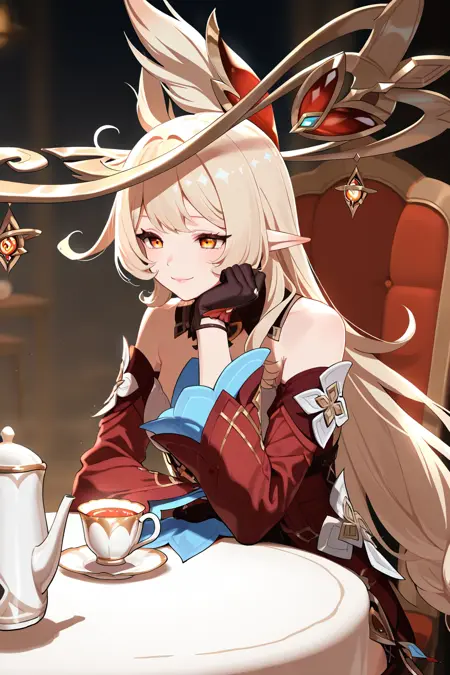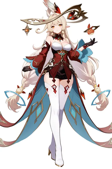 alice \(原神\), 1girl, 金发, 手套, 长发, 尖耳, 红眼, 过膝袜, 黑色手套, 分离袖子, 白色过膝袜, 裸露肩膀, 极长发, 辫子, 长袖, 光环, 帽子