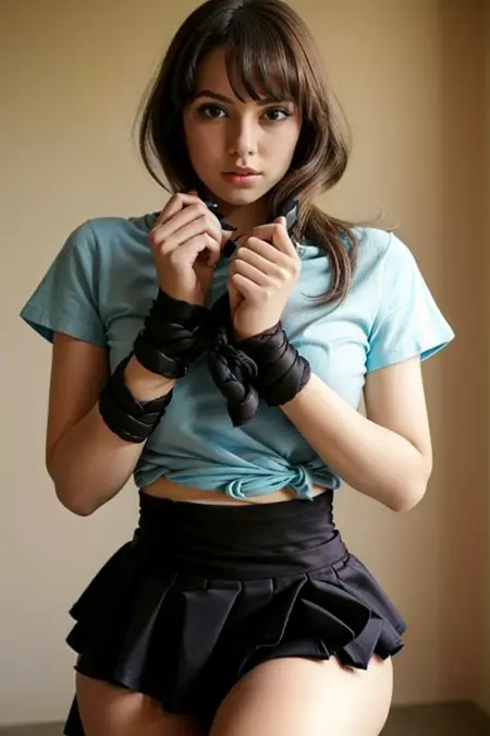 가중치를 0.7 정도로 시작하세요. 트리거 단어 "handtie"를 문장 앞부분에 사용하세요. 그러나 여기서 문제가 발생합니다—사람의 팔이 서로 붙어 있지 않다면, 팔이 묶인 모습을 볼 수 없으므로, 프롬프트에 "줄로 손을 함께 묶음"과 같은 표현도 추가하는 것을 권장합니다. 또는 이 LoRA 위에 ControlNet을 사용하여 내 샘플 이미지 중 하나를 적용하세요.