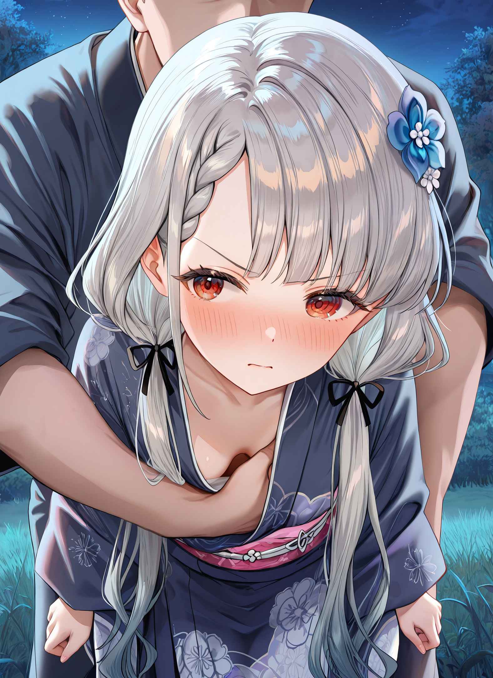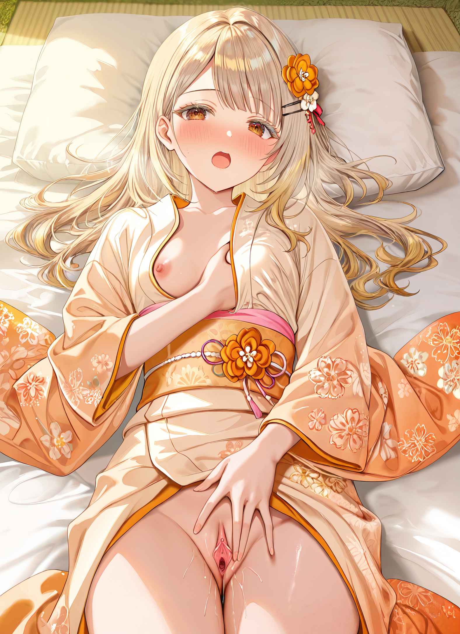 japanese clothes, kimono, hand under kimono, grab breasts, obi