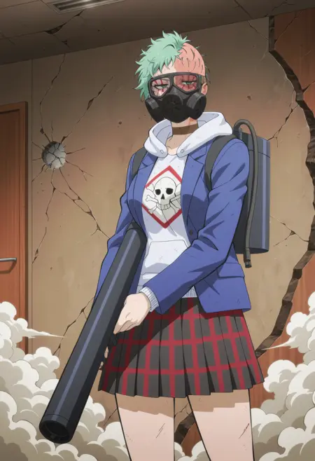| トレーニングワード | 1girl,solo,mm,mature female,burn scar,scar on face,shaved head,asymmetrical hair,green hair,short hair,green eyes,scar across eye,anime coloringコピーしました! choker,white hoodie,skull print,blue jacket,plaid skirt,pleated skirt,black skirt,loose socks,white socks,sneakers,white footwearコピーしました! |