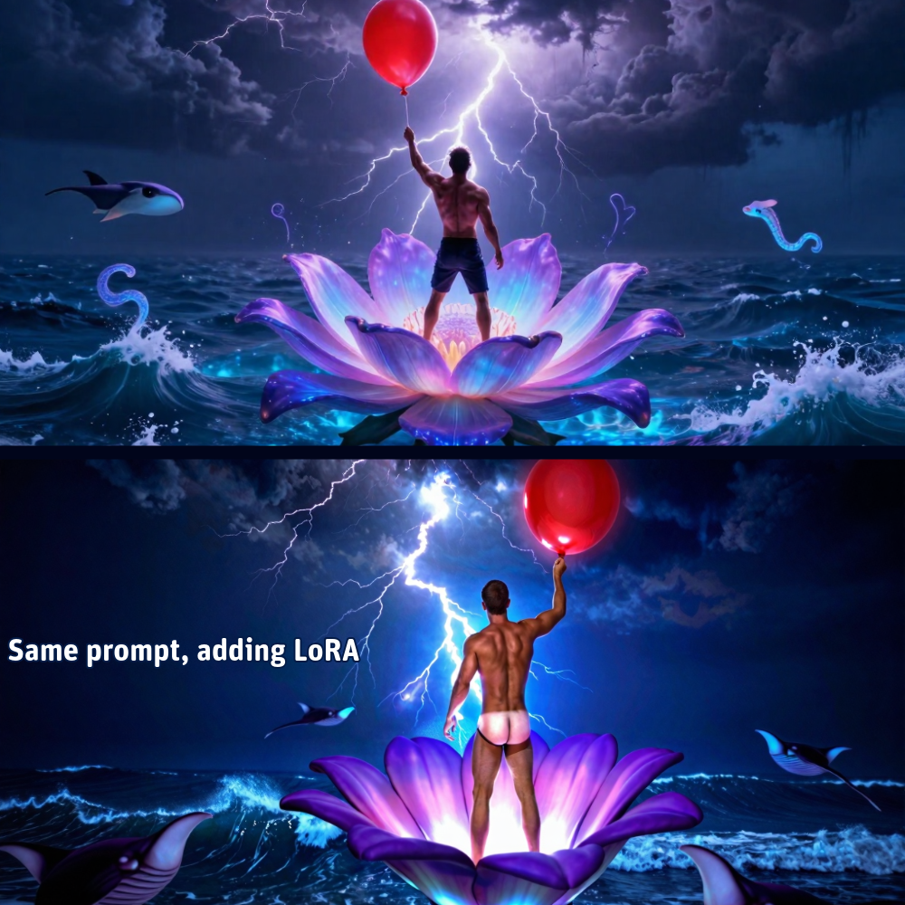 これは私がこれまで作成し、ここで共有した初めてのキャラクター以外のLoRAです。最初の例では、男性がカメラに向かって背中を向け、スピードーの日焼け跡があると示されています。私のLoRAがないと、その状況を再現するのは繰り返し難しく、プロンプトを正確に調整するのに多くの時間がかかります。私はこれをジェンダー中立としてキャプションしましたが、すべての学習画像は男性でした。