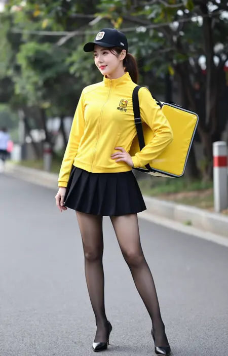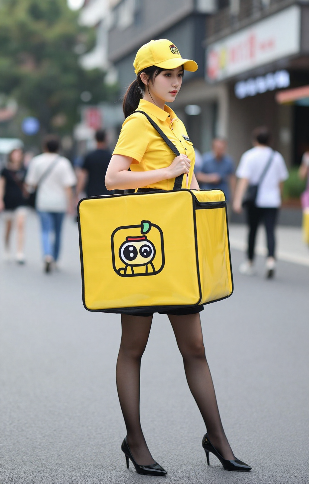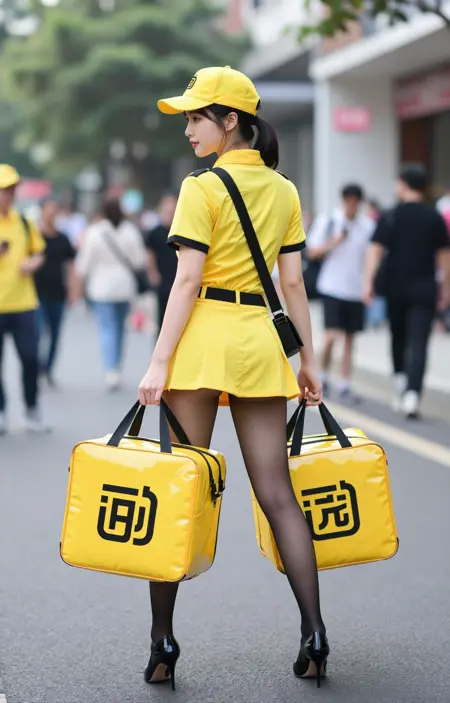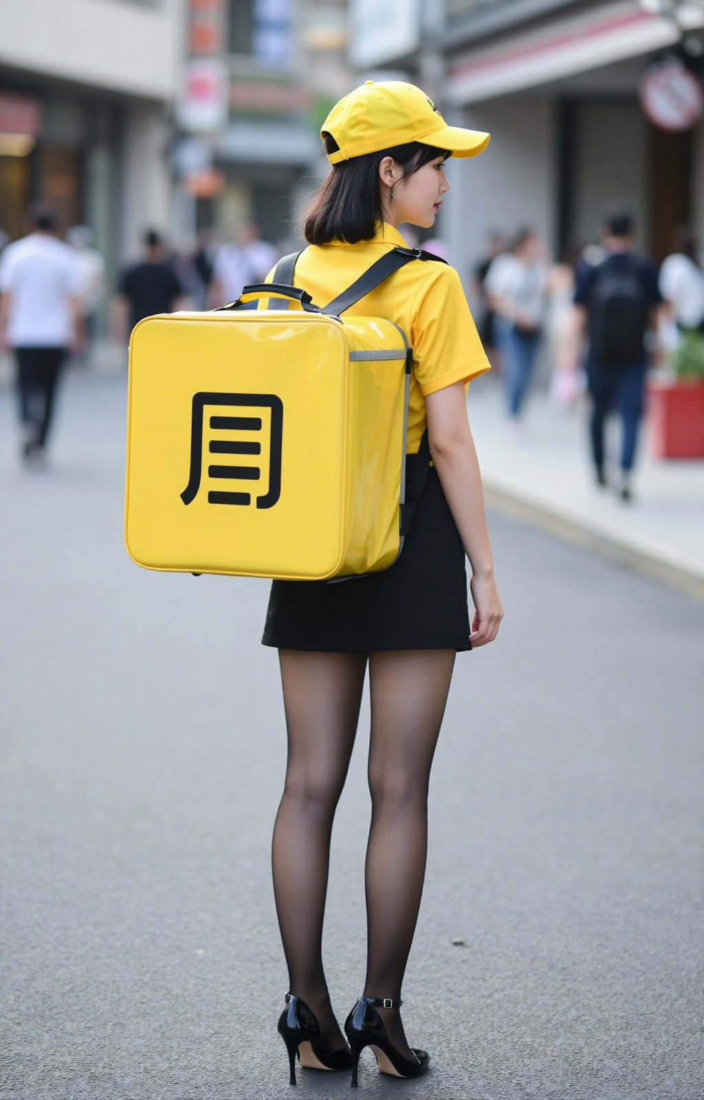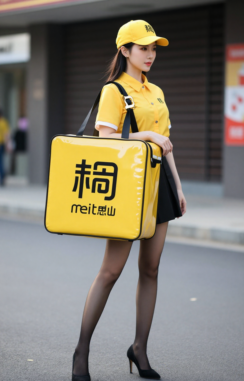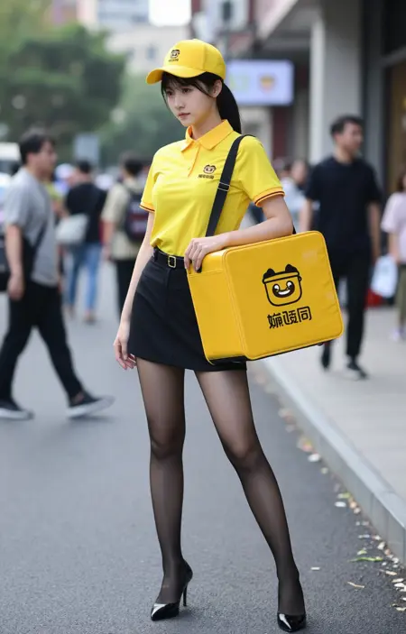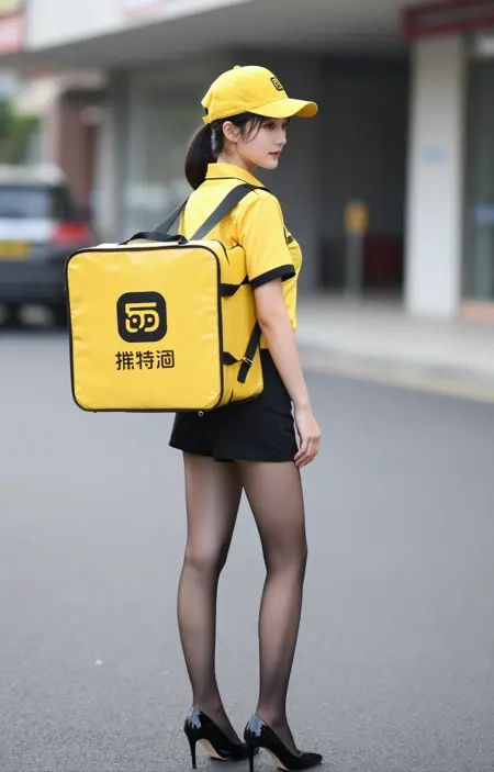 トリガー:大きな黄色い四角いバッグ、Meituan黄色のユニフォーム、Meituan、1人 Girl、パンティストッキング、ハイヒール、ユニフォーム、バッグ、帽子、単独、ぼやけた、黒髪、ぼやけた背景、黒い靴下、スカート、屋外、シャツ、バッグを持っている、立っている、黒いパンティストッキング、黄色いシャツ、リアル、全身、ベースボールキャップ、短袖、ショートパンツ