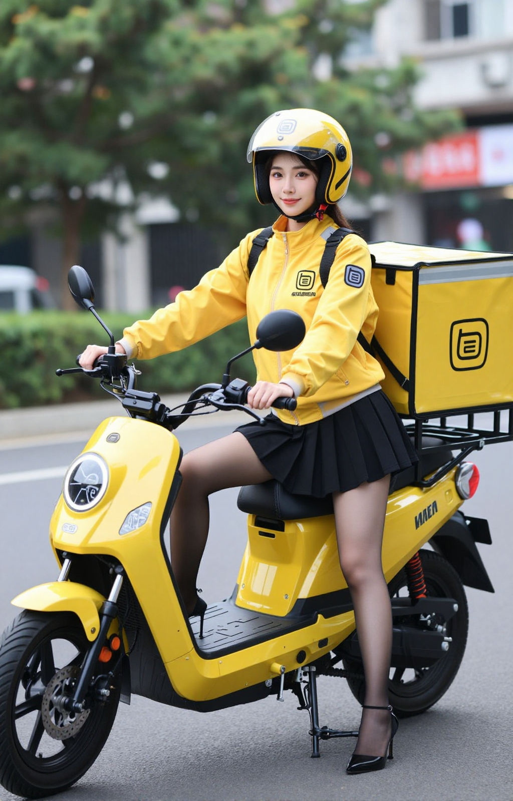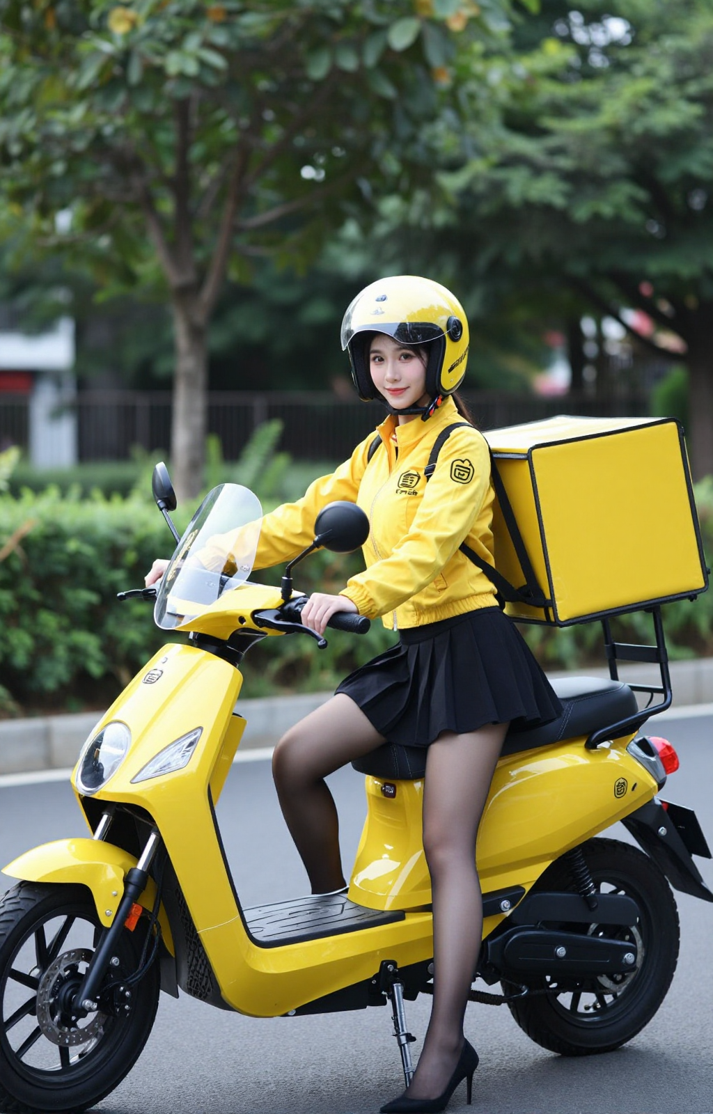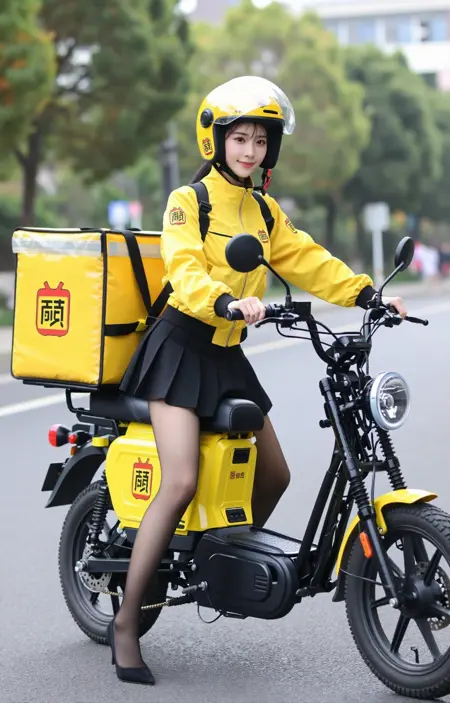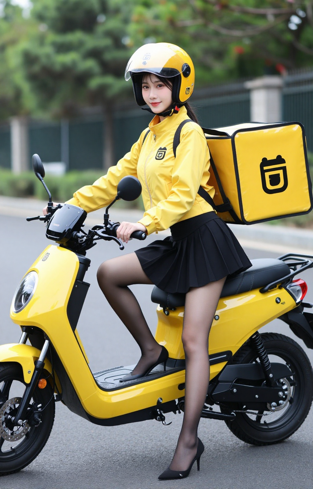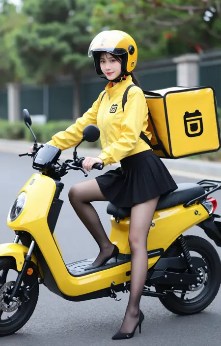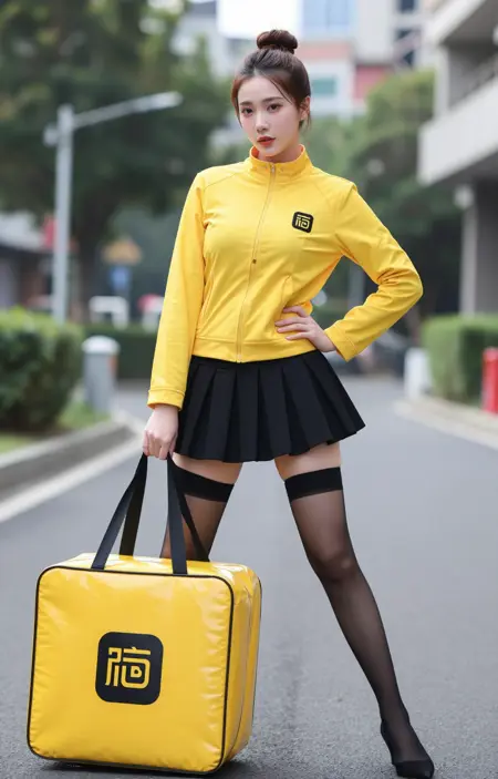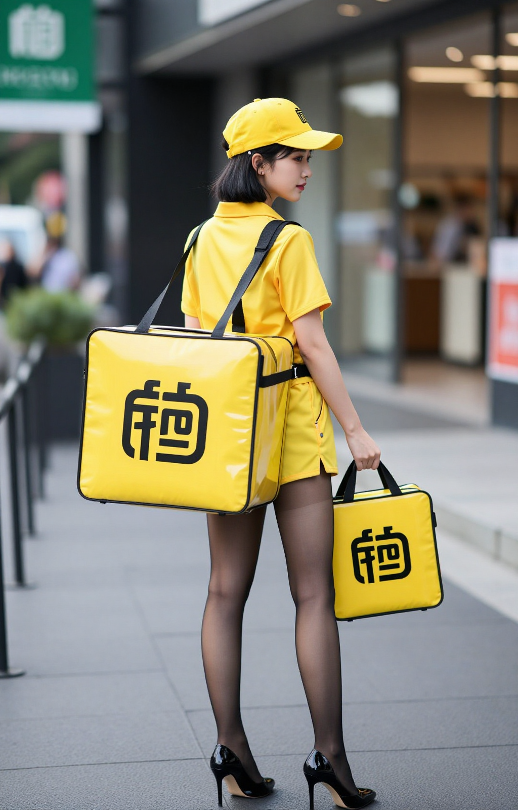 トリガー:大きな黄色い四角いバッグ、Meituan黄色のユニフォーム、Meituan、1人 Girl、パンティストッキング、ハイヒール、ユニフォーム、バッグ、帽子、単独、ぼやけた、黒髪、ぼやけた背景、黒い靴下、スカート、屋外、シャツ、バッグを持っている、立っている、黒いパンティストッキング、黄色いシャツ、リアル、全身、ベースボールキャップ、短袖、ショートパンツ