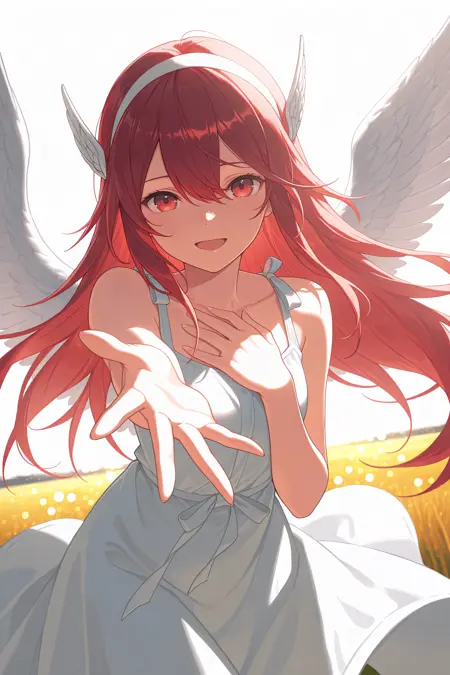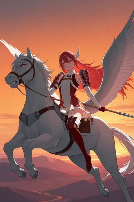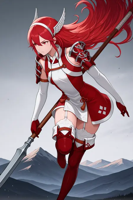 彼女の典型的な外見には、「翼型の髪飾り、白いヘアバンド、肩の鎧、赤い鎧、白いタバード、赤いドレス、多色のドレス、短いドレス、袖なしのドレス、白い袖、赤い手袋、ガーターストラップ、赤いブーツ、太ももブーツ」を追加してください。