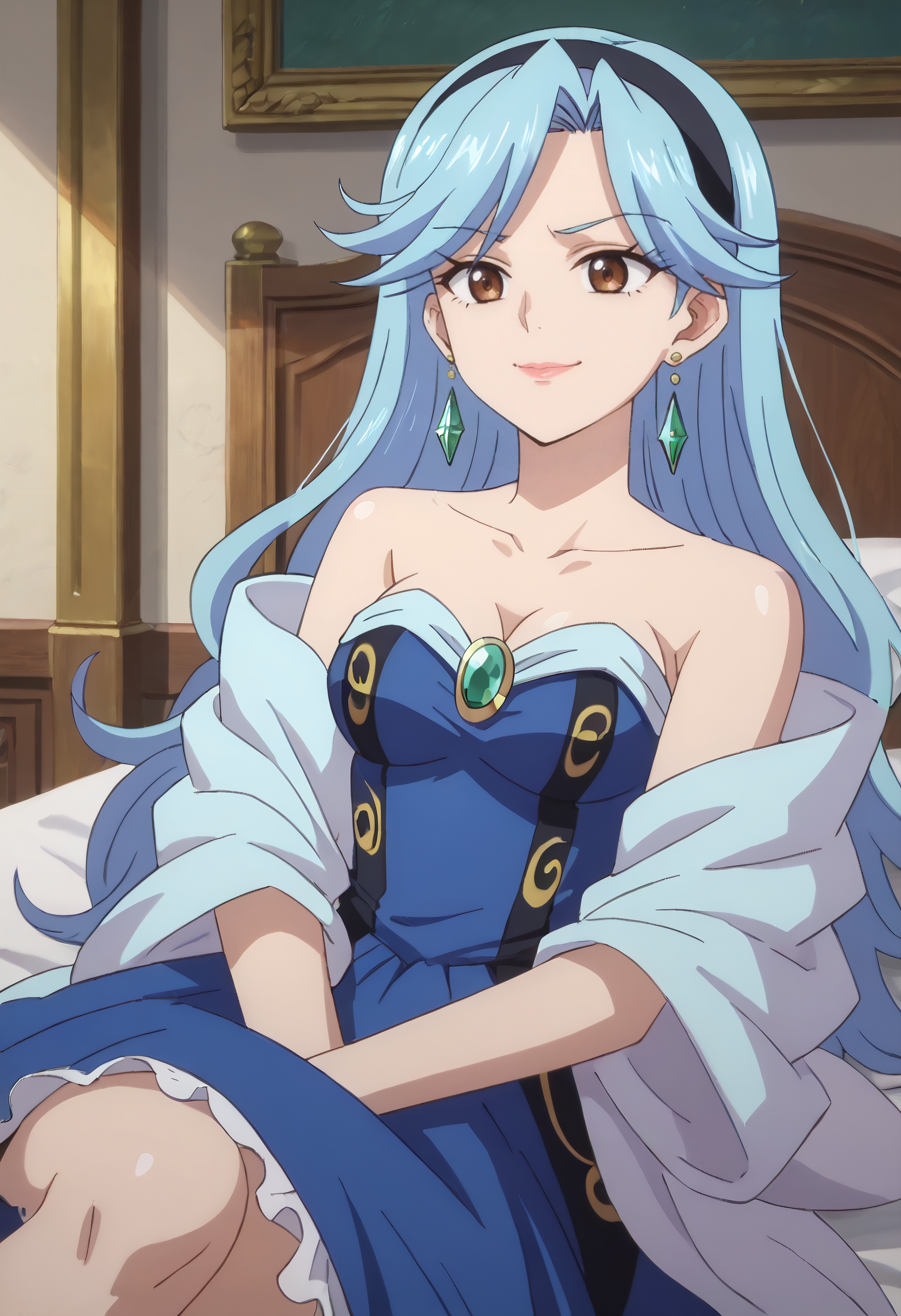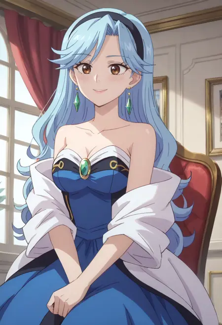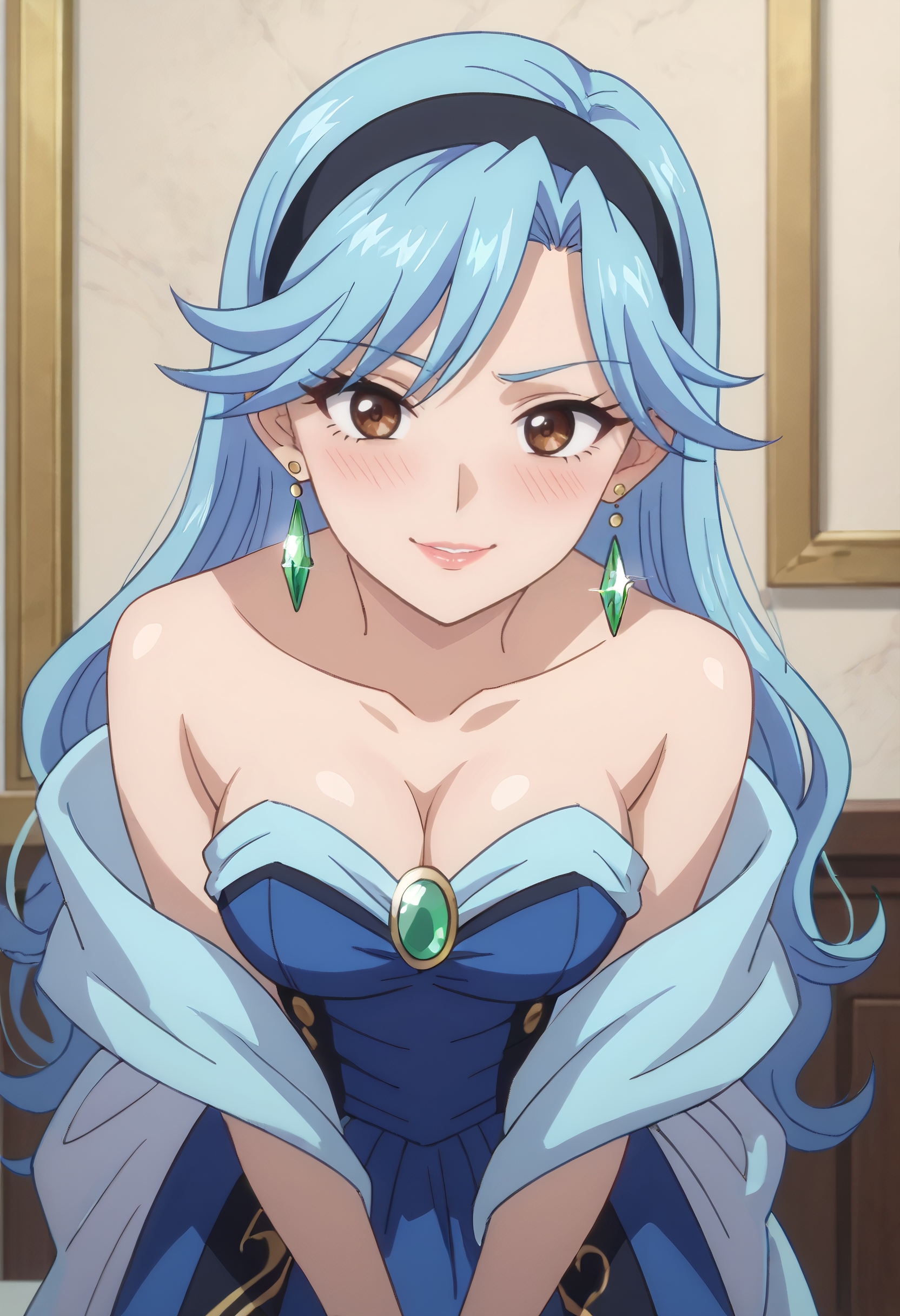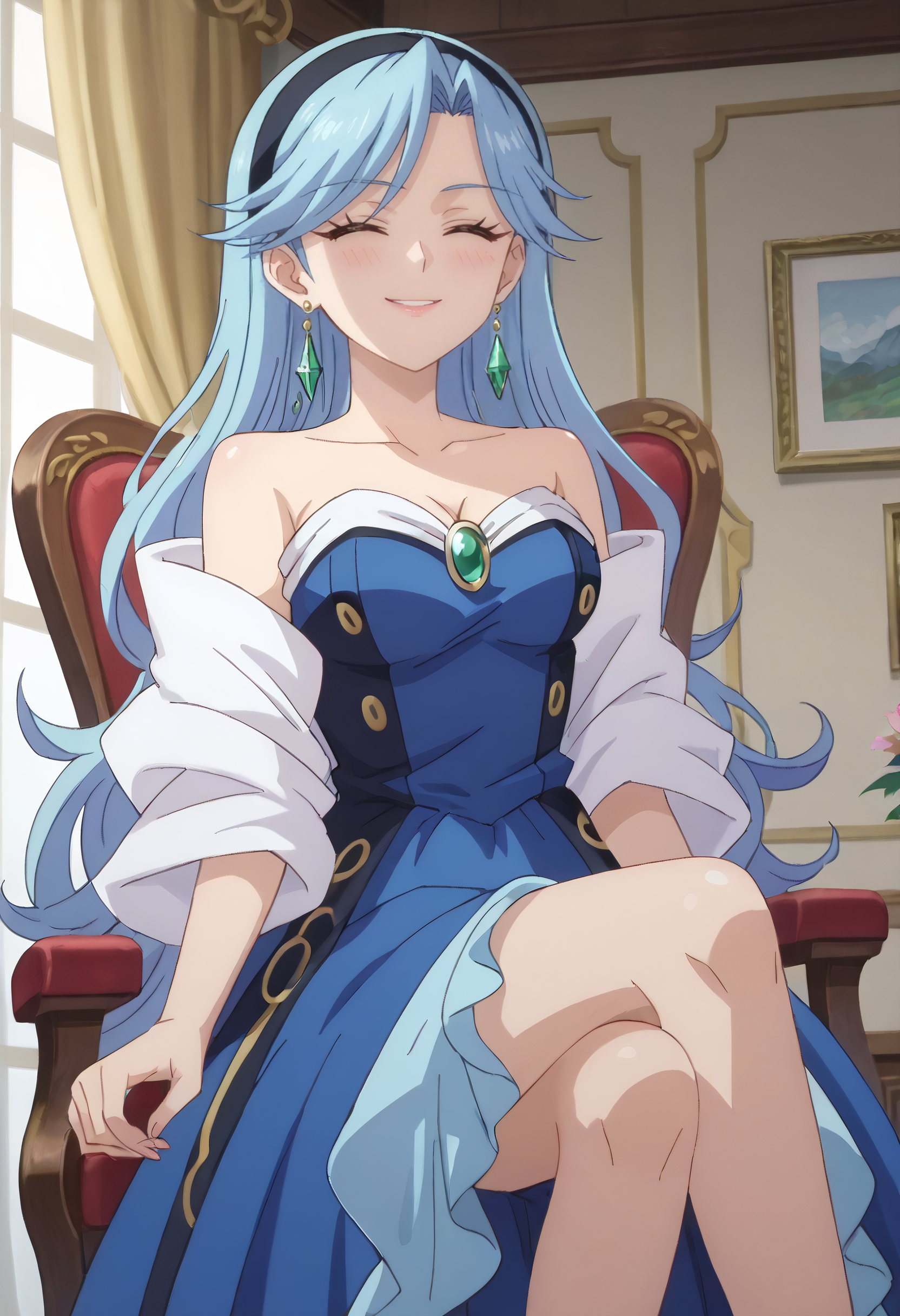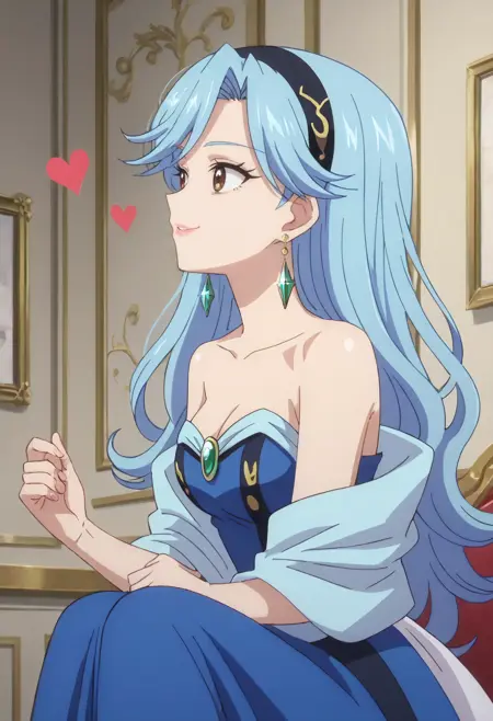 FloraDress, jewelry, collarbone, earrings, dress, bare shoulders, cleavage, strapless, strapless dress, hoop earrings, off shoulder, hairband, single earring, blue dress, wide sleeves, heart earrings, gem, off-shoulder dress,