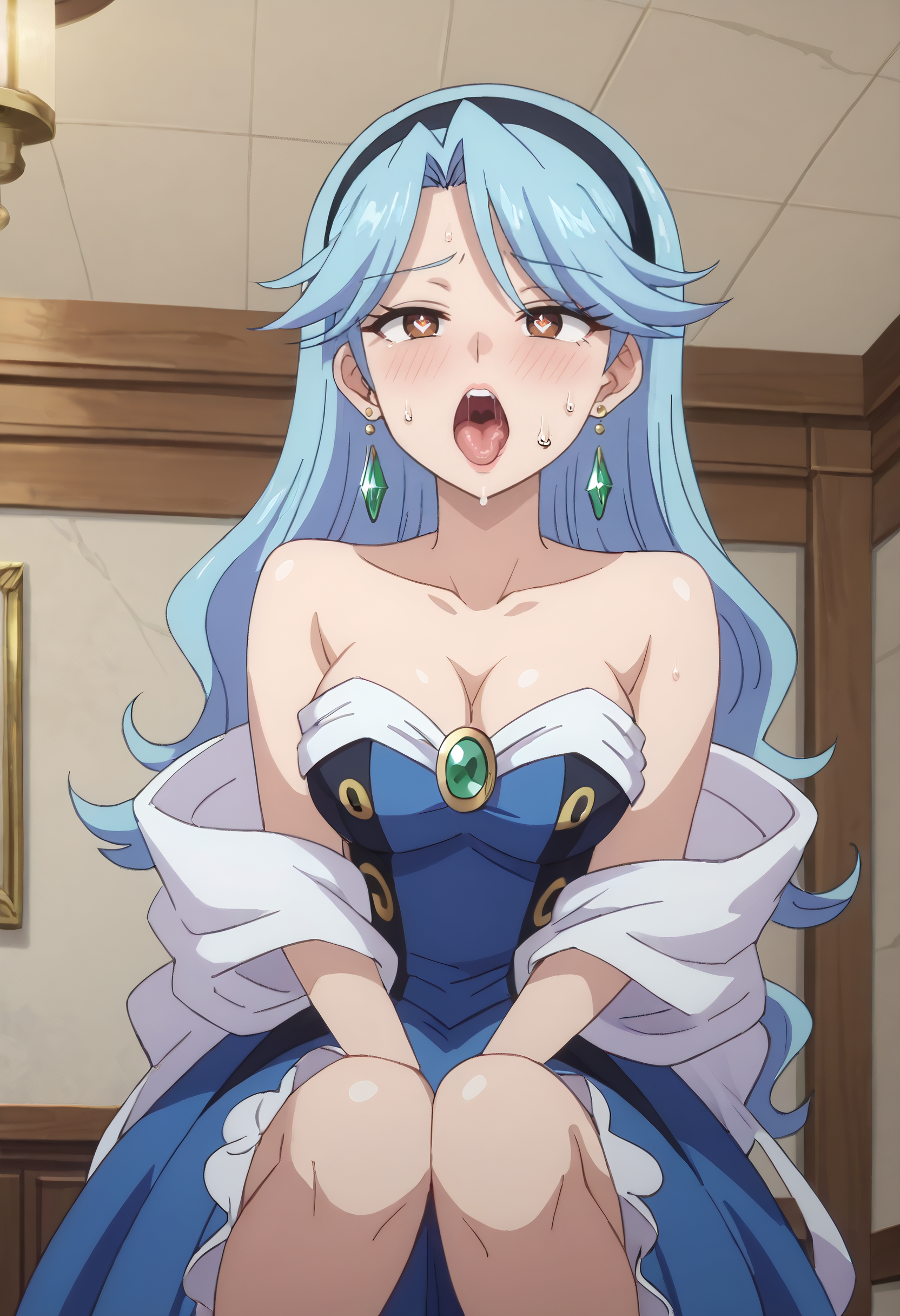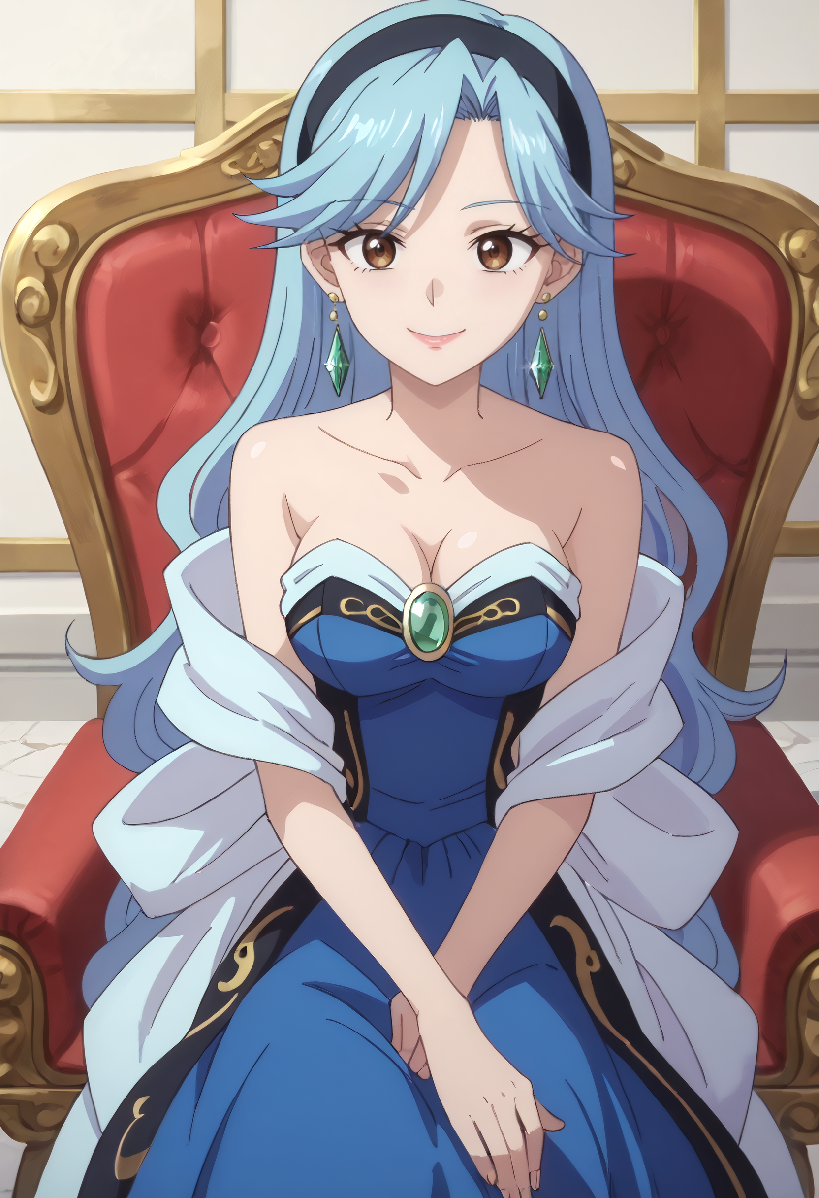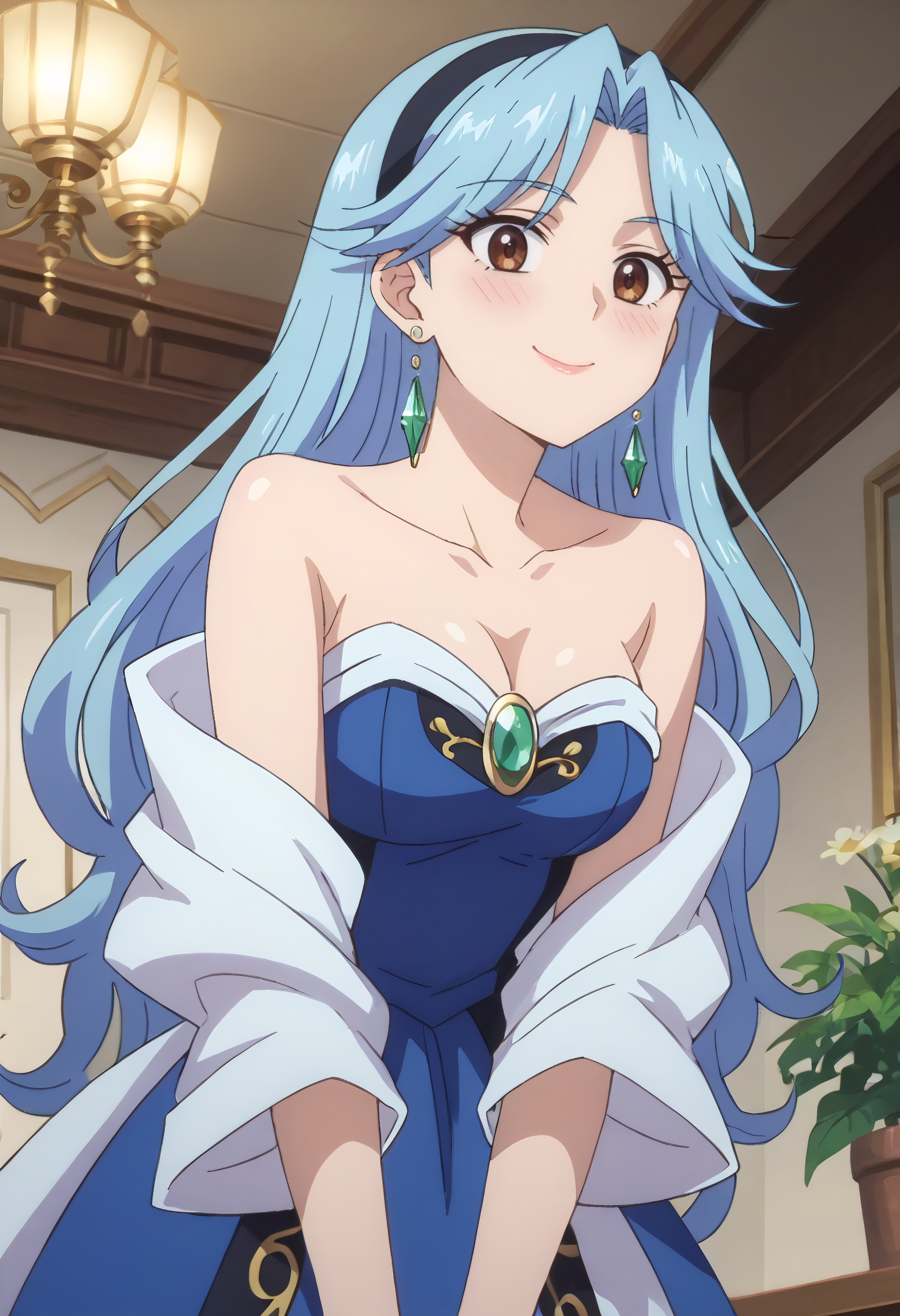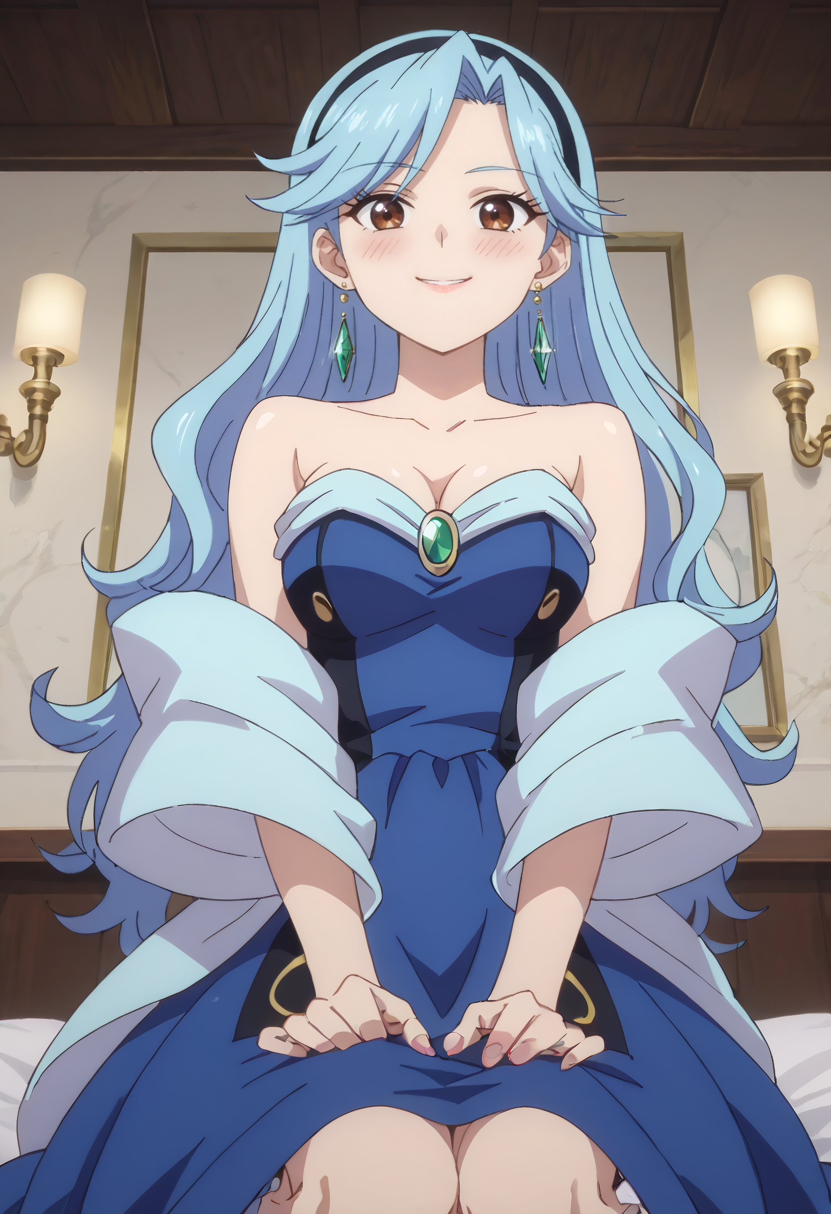 FloraDress, jewelry, collarbone, earrings, dress, bare shoulders, cleavage, strapless, strapless dress, hoop earrings, off shoulder, hairband, single earring, blue dress, wide sleeves, heart earrings, gem, off-shoulder dress,