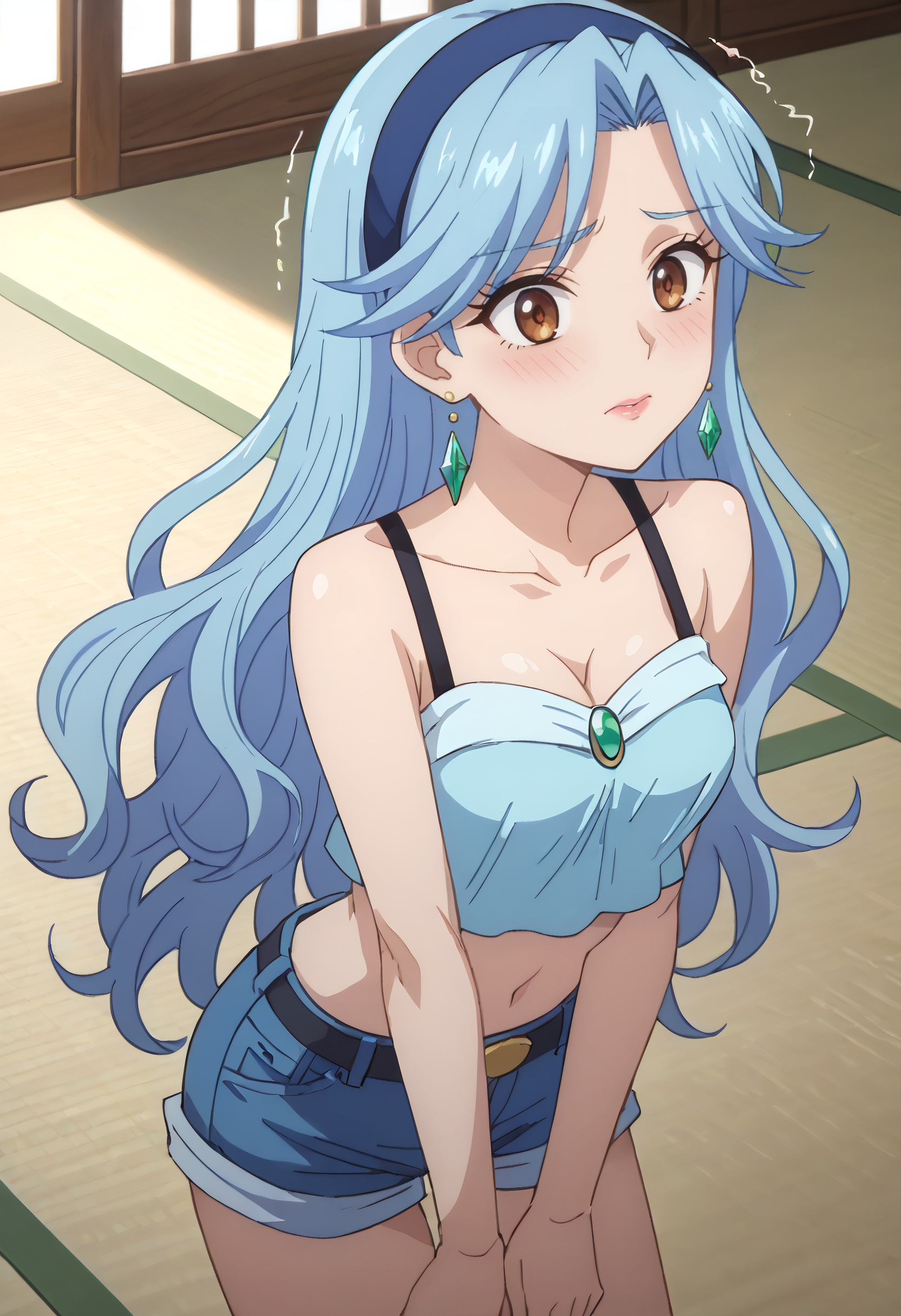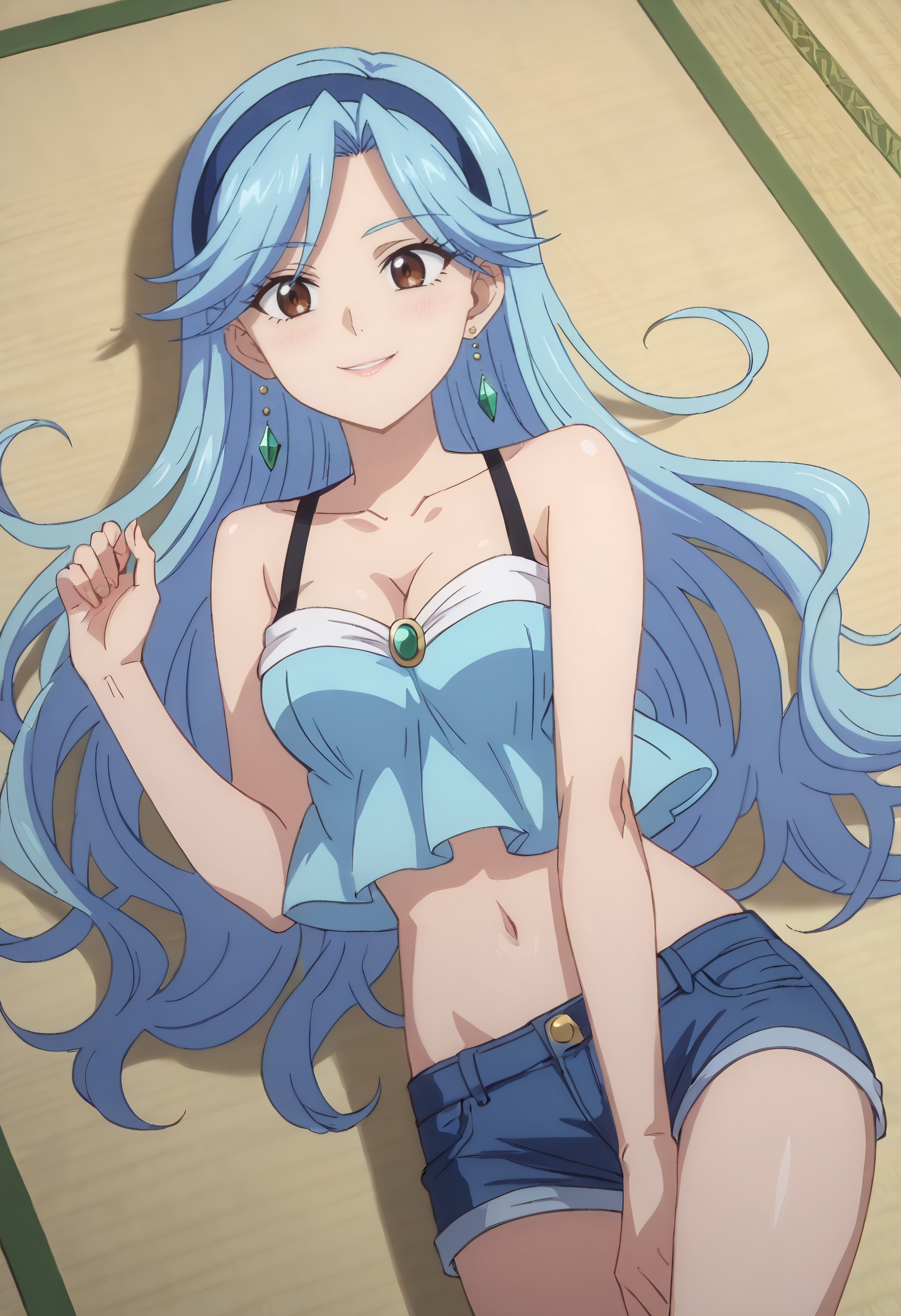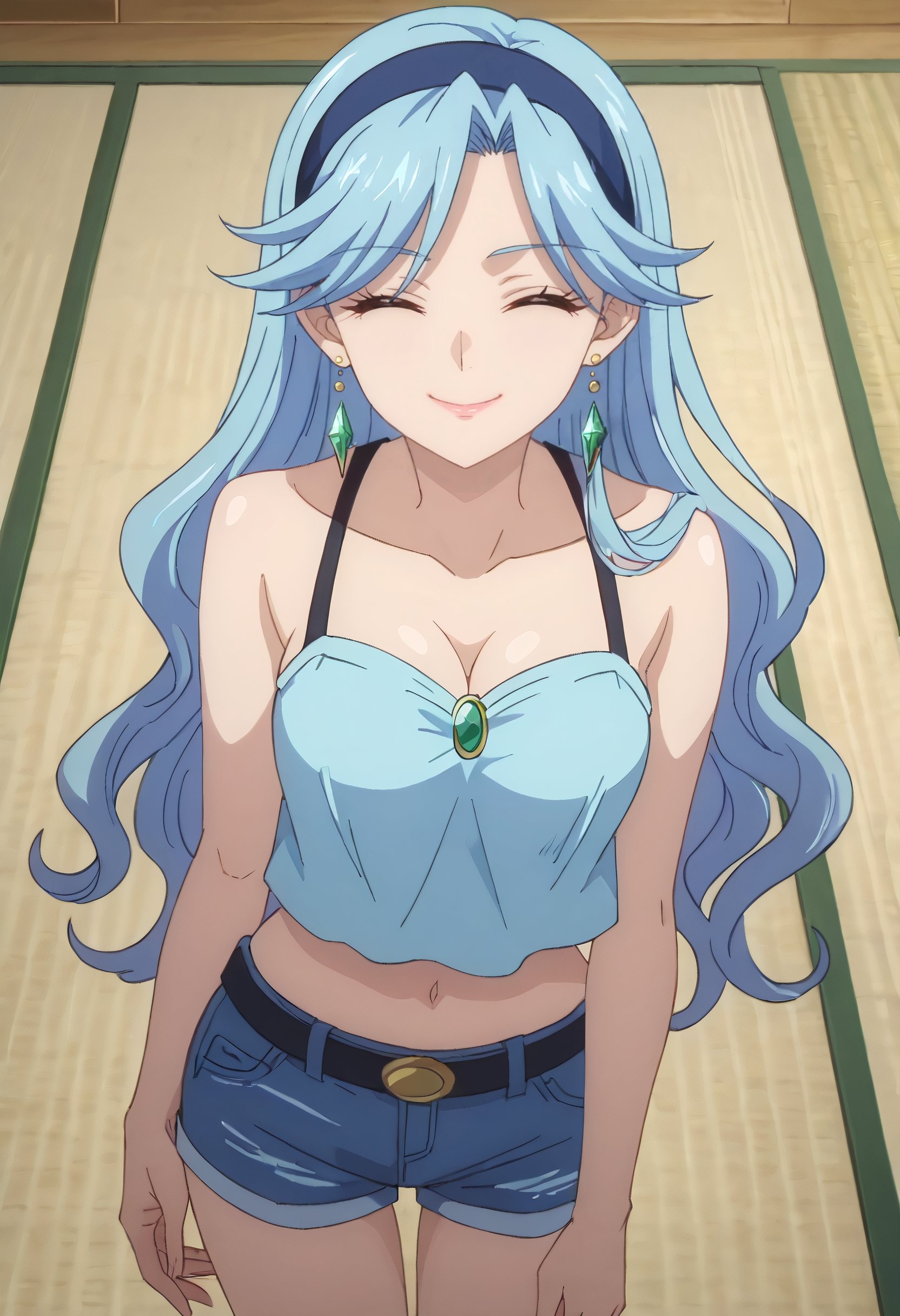 FloraSwimsuit, crop top, midriff, navel, hairband, cleavage, swimsuit, bare shoulders, collarbone, shorts, tatami, sleeveless, short shorts, denim, denim shorts, blue hairband,