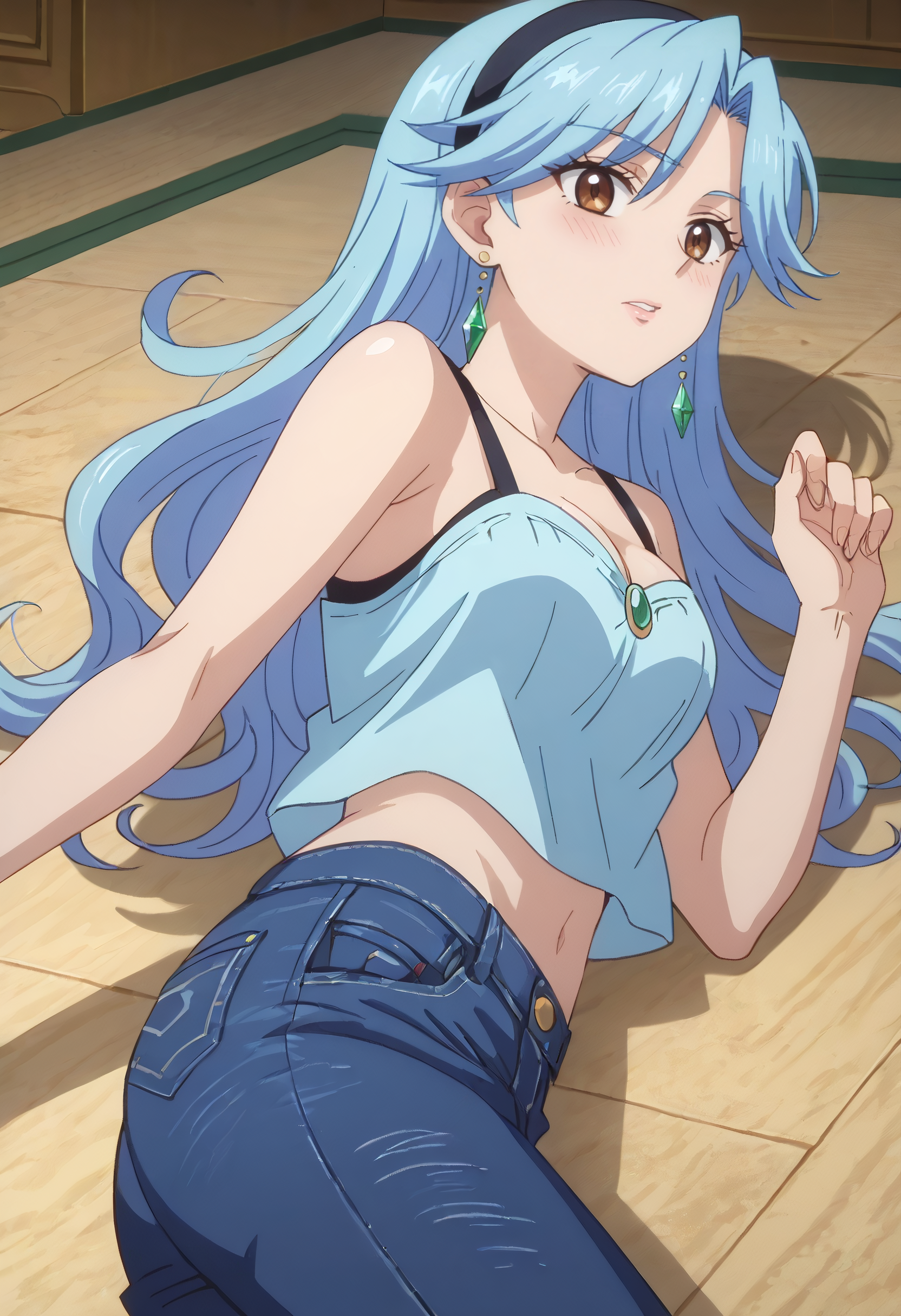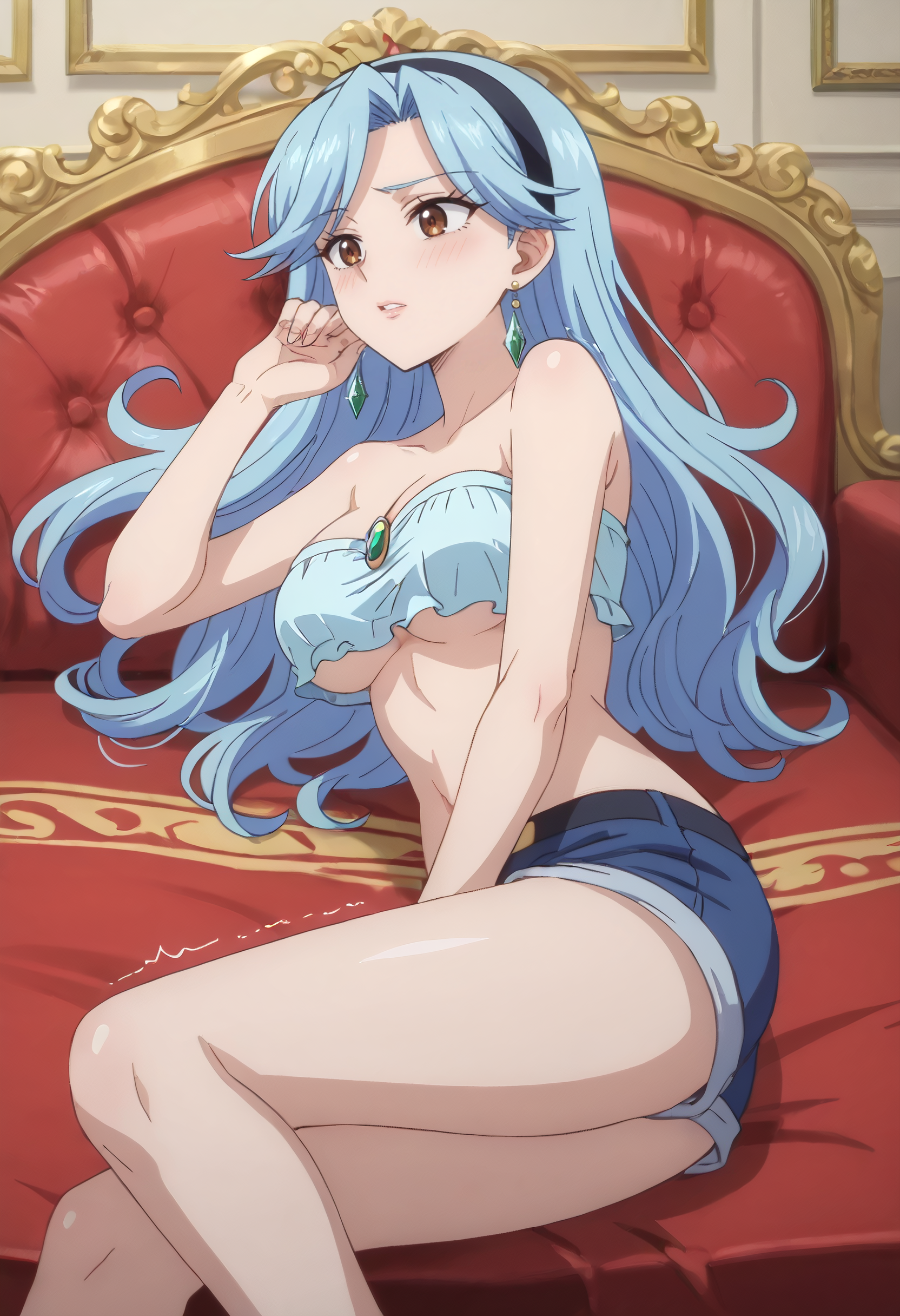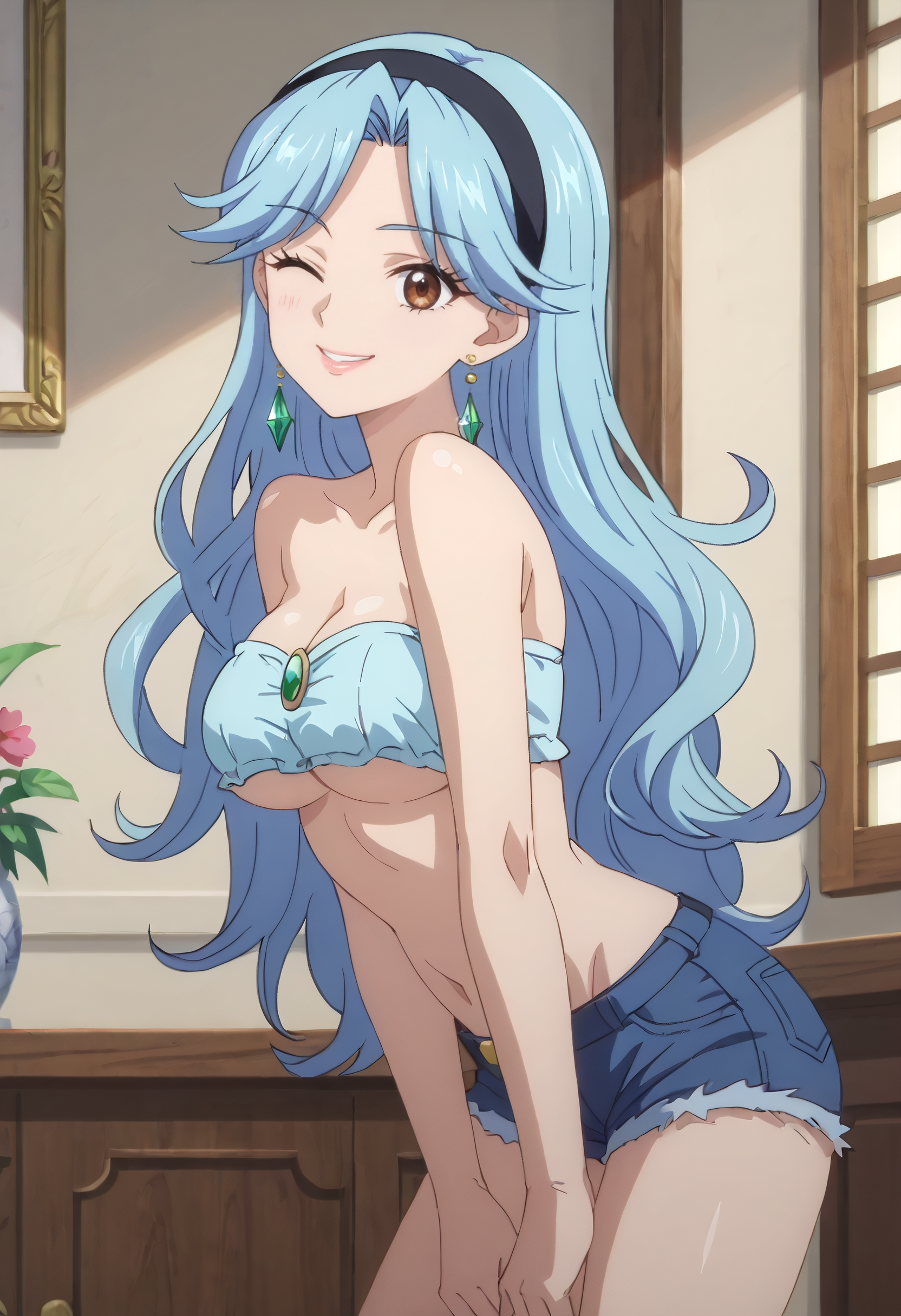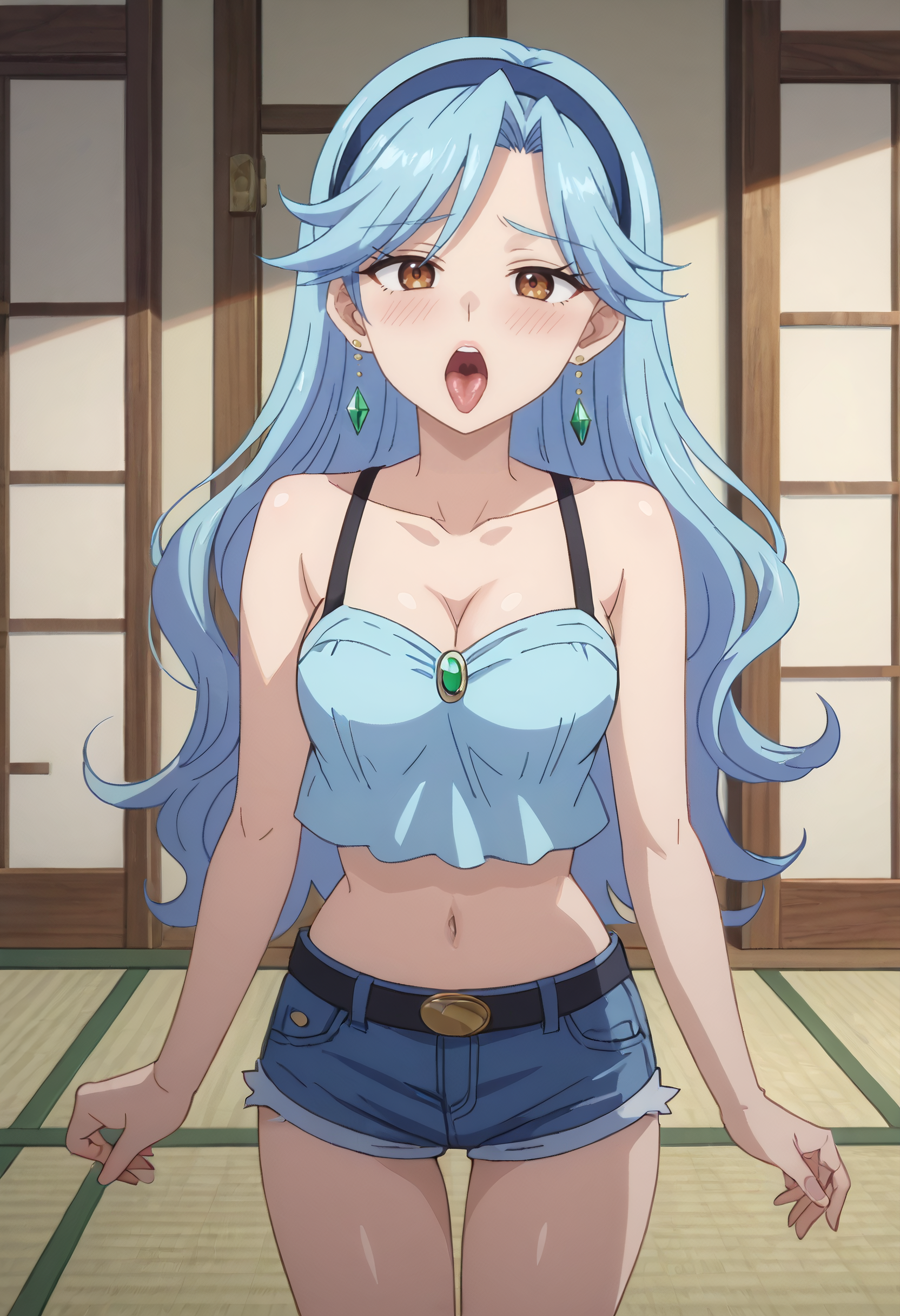FloraSwimsuit, crop top, midriff, navel, hairband, cleavage, swimsuit, bare shoulders, collarbone, shorts, tatami, sleeveless, short shorts, denim, denim shorts, blue hairband,