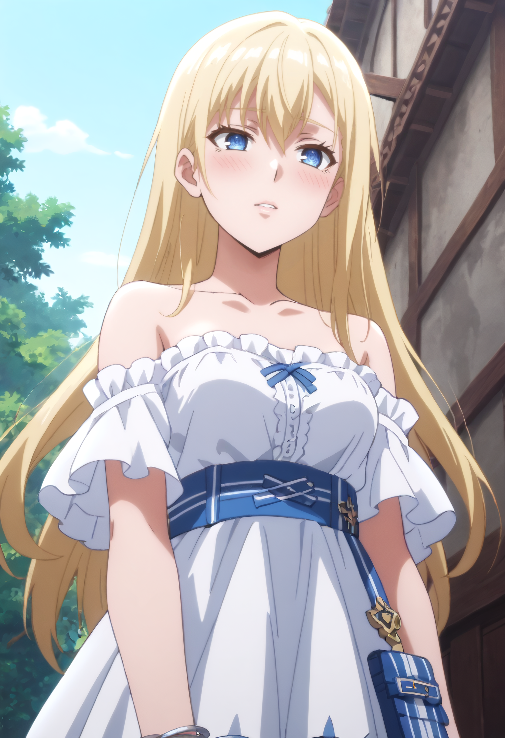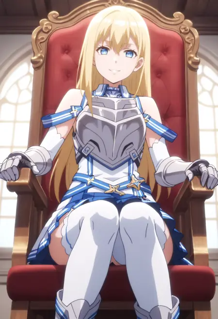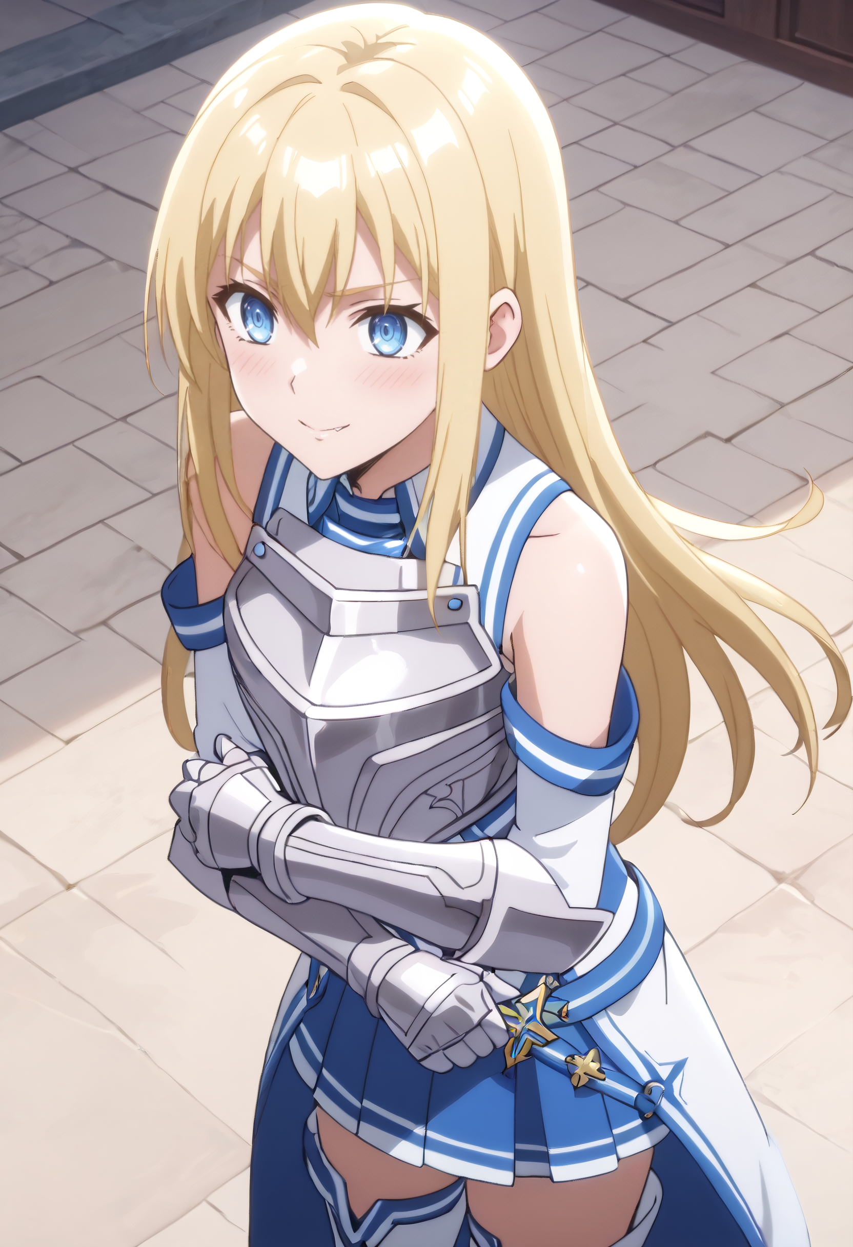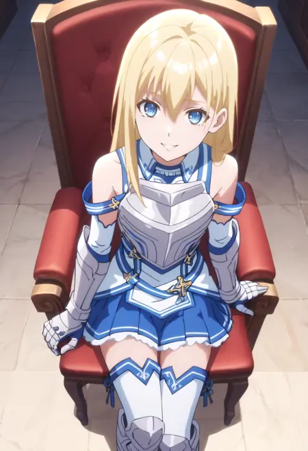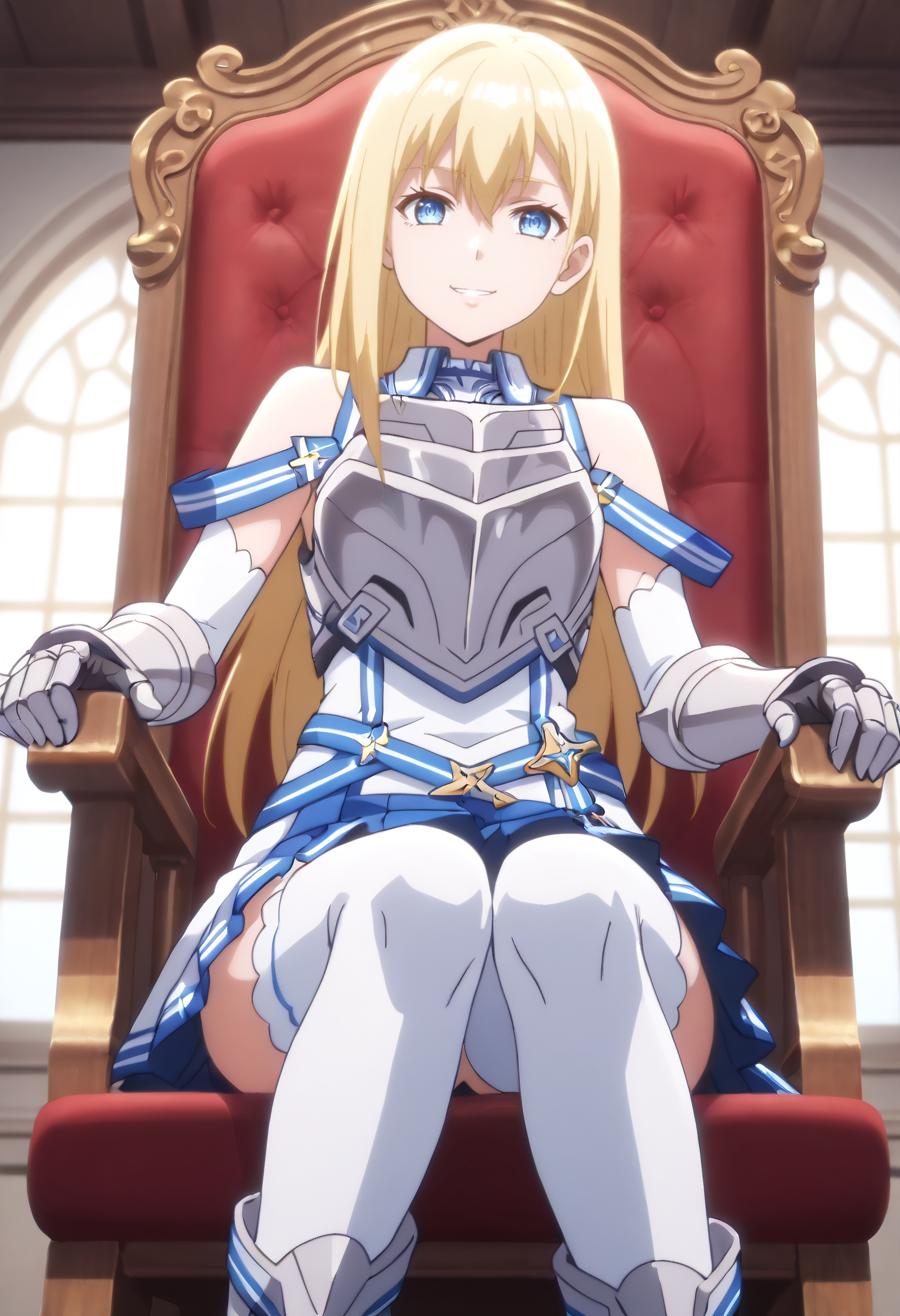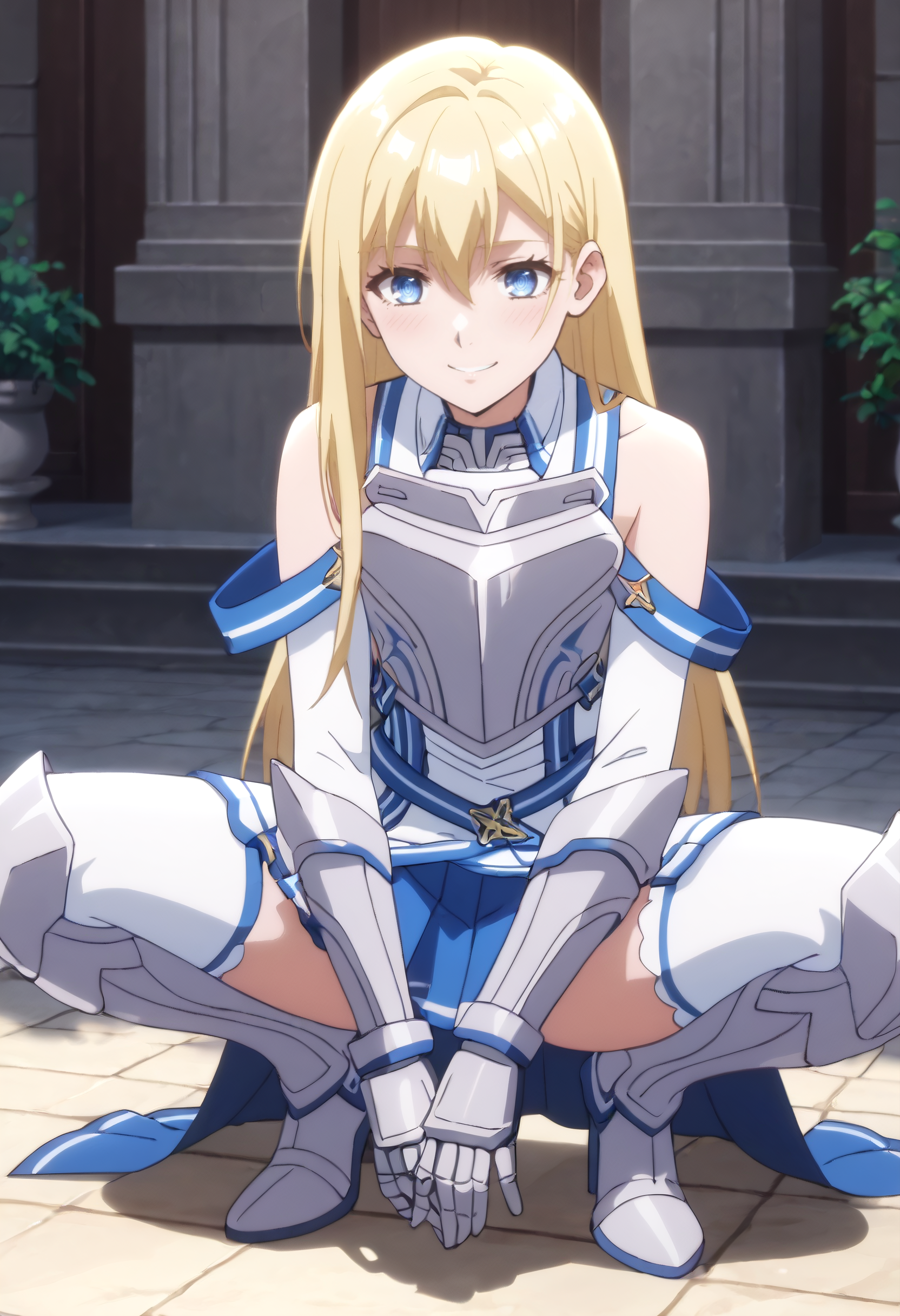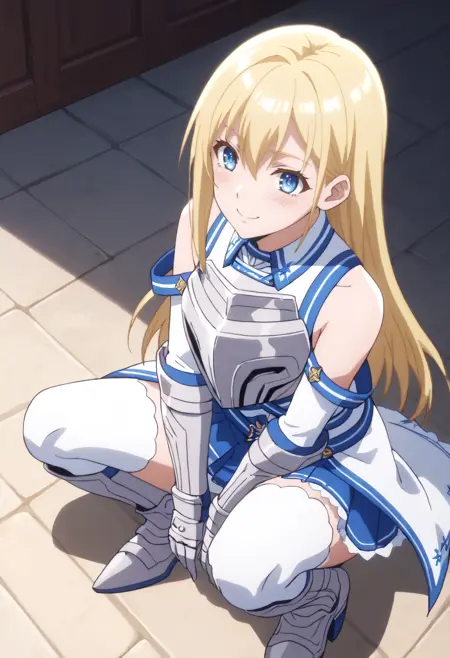 RoxyArmor, 갑옷, 장갑, 팔꿈치 장갑, 어깨 노출, 치마, 분리된 소매, 흰 장갑, 허벅지 긴 양말, 가슴판, 셔츠, 드레스, 장갑, 갑옷 드레스, 소매 없음, 파란 치마, 흰 다리 착용, 주름 치마, 부츠, 하이레그, 갑옷 부츠,