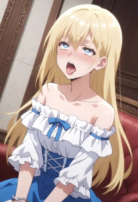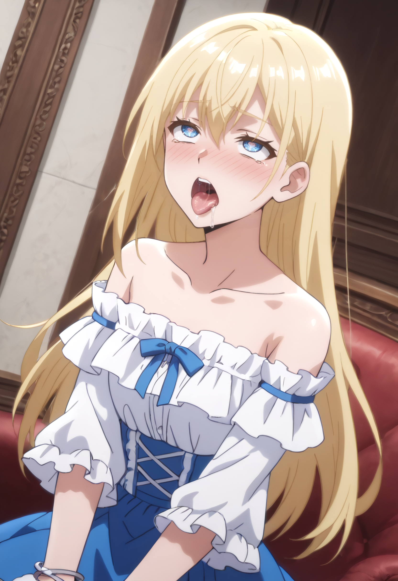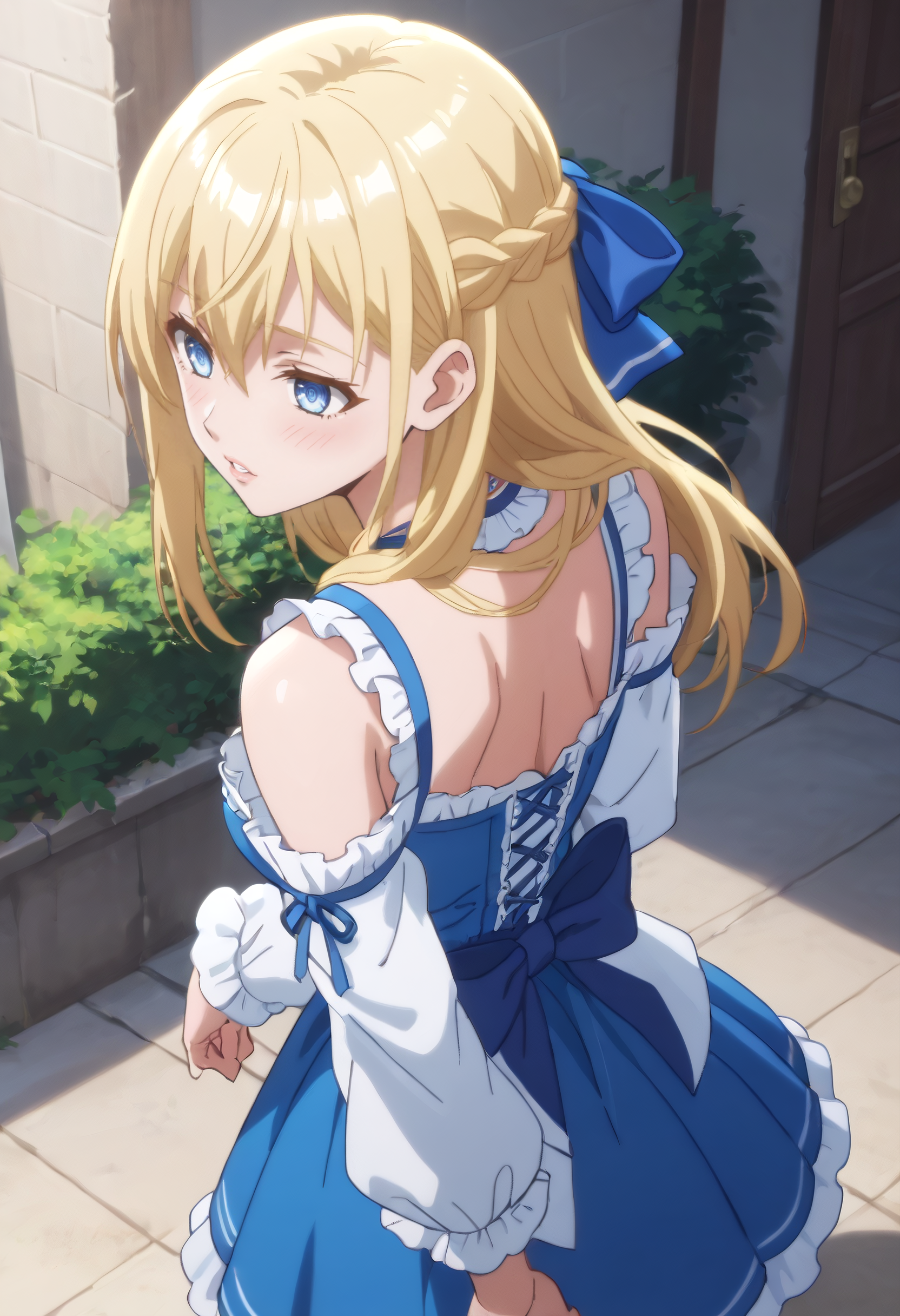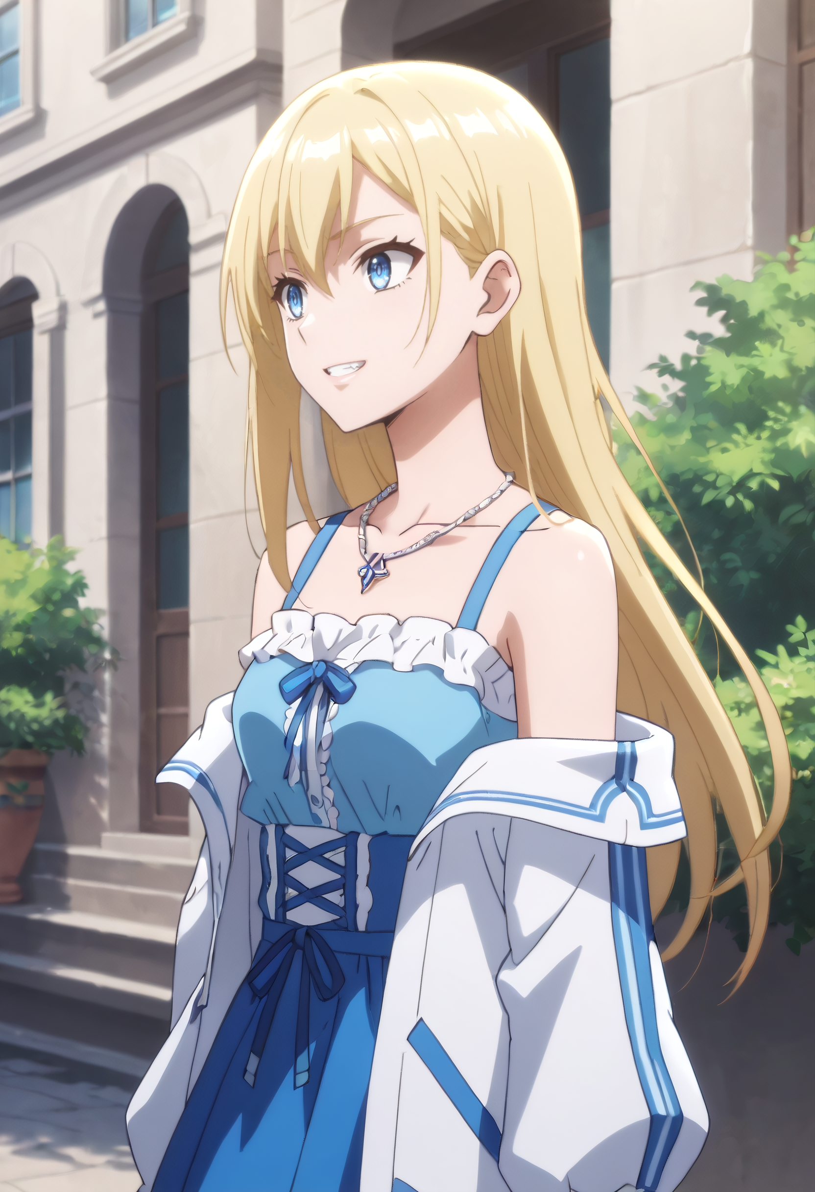 RoxyBlueDress, 드레스, 긴 소매, 잠금뼈, 어깨 노출, 소매 없음, 파란 드레스, 파란 리본, 파란 활, 재킷, 보석, 목걸이, 프릴, 캐주얼, 리본, 볼륨 있는 소매, 파란 치마, 흰 재킷,