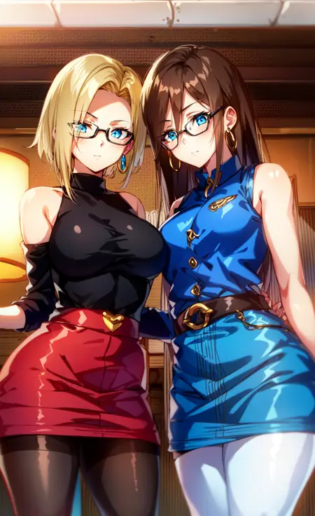 アンドロイド18、金髪、パンティーストッキング、スカート、青い目、ブーツ、短い髪、腕を組む、黒いパンティーストッキング、イヤリング、デニムジャケット、ジュエリー、デニムスカート、デニム、茶色の靴、胸、立っている、ジャケット