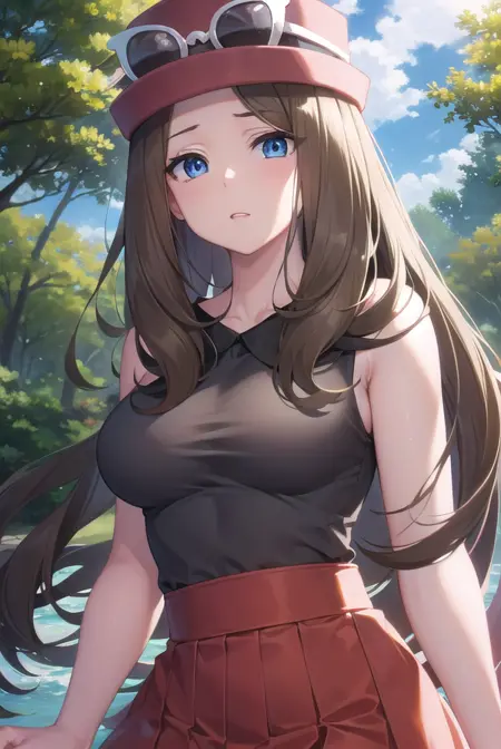 頭に眼鏡、帽子、スカート、サングラス、シャツ、黒いシャツ、ノースリーブ、赤いスカート、ピンクの帽子、