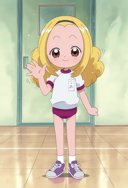 Gym: erika (character), gym (outfit), 1girl, brown eyes, blonde hair, long hair, wavy hair, blue hairband, white shirt, white shirt with magenta accents, short sleeves, magenta buruma, name tag, white socks, purple sneakers