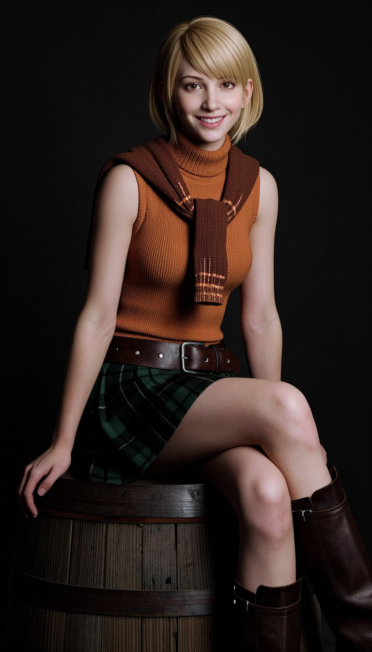 a2h1e7graham, realistic, a photo of a2h1e7graham, a woman, with blonde hair, bob cut, bangs, golden eyes, orange turtleneck, brown sweater draped over shoulder, sleeveless, green plaid skirt, brown belt, black knee boots,