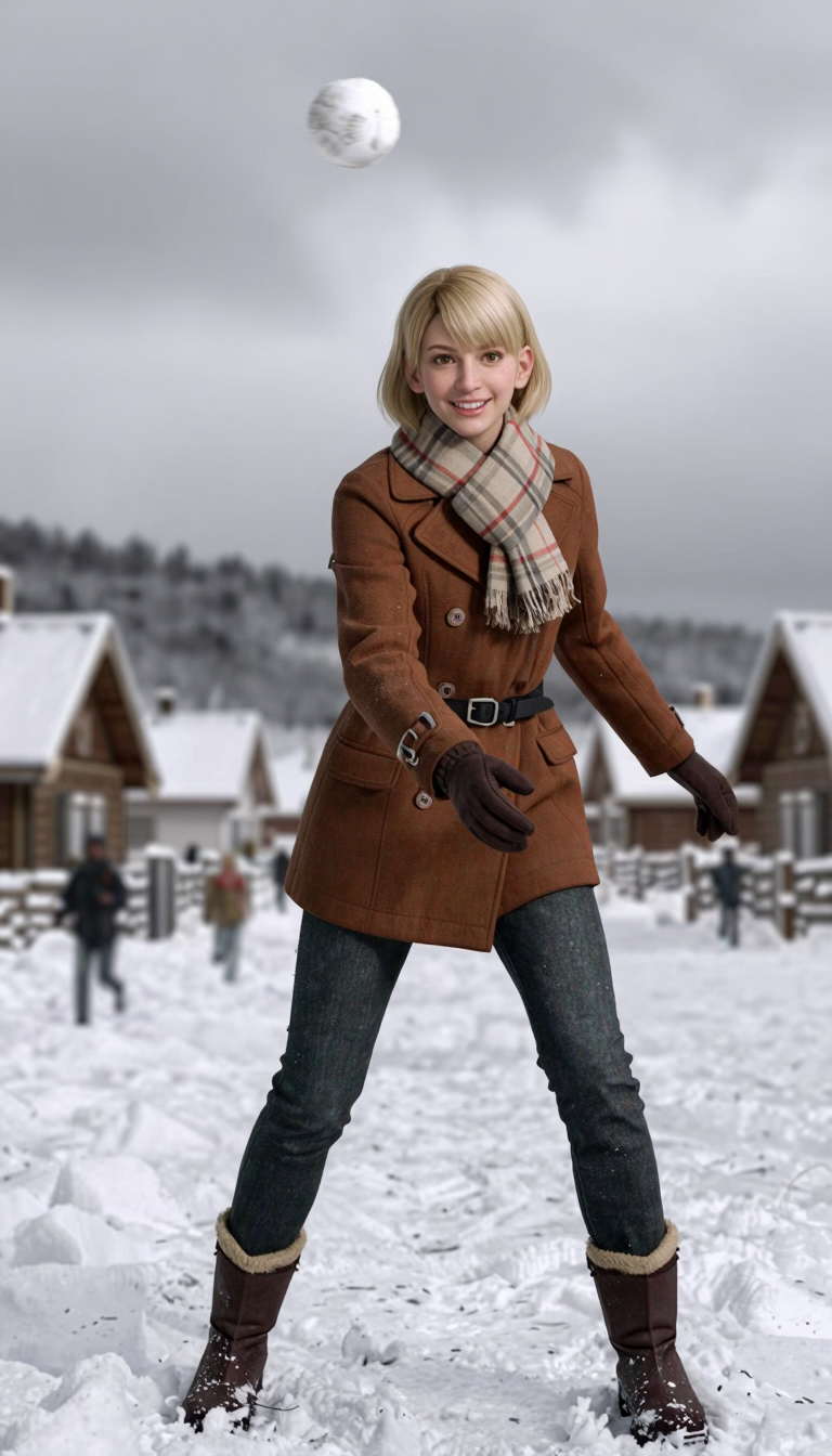 a2h1e7graham, realistic, a photo of a2h1e7graham, a woman, with blonde hair, bob cut, bangs, golden eyes, brown coat, plaid scarf, black belt, brown gloves, jeans, brown boots with fur trim,