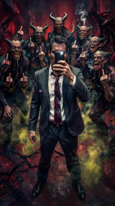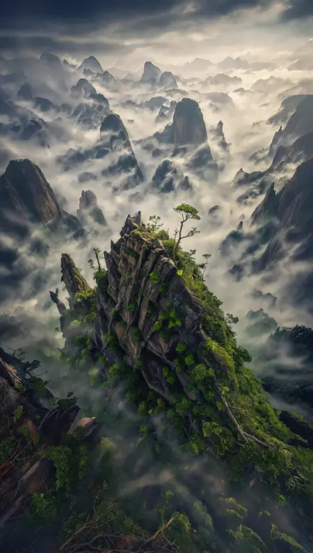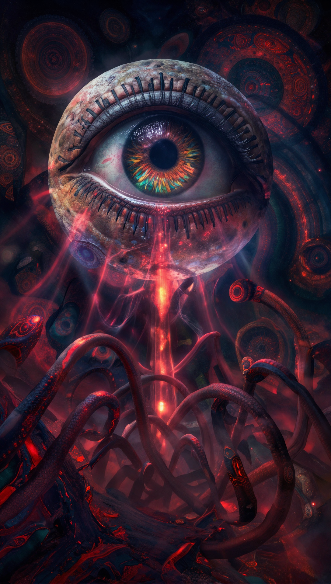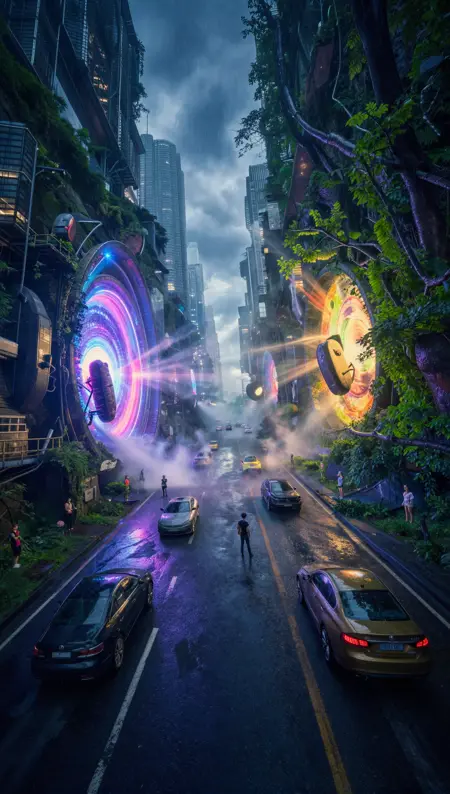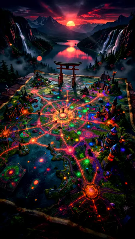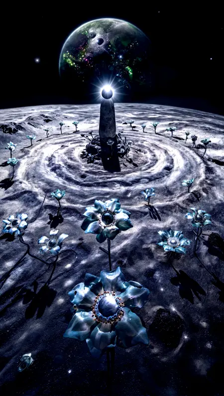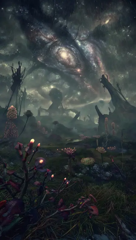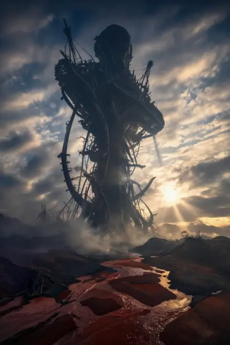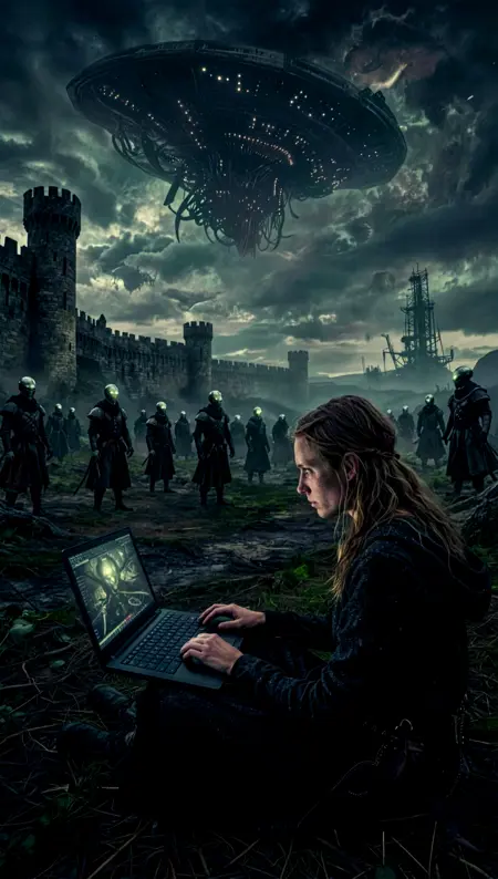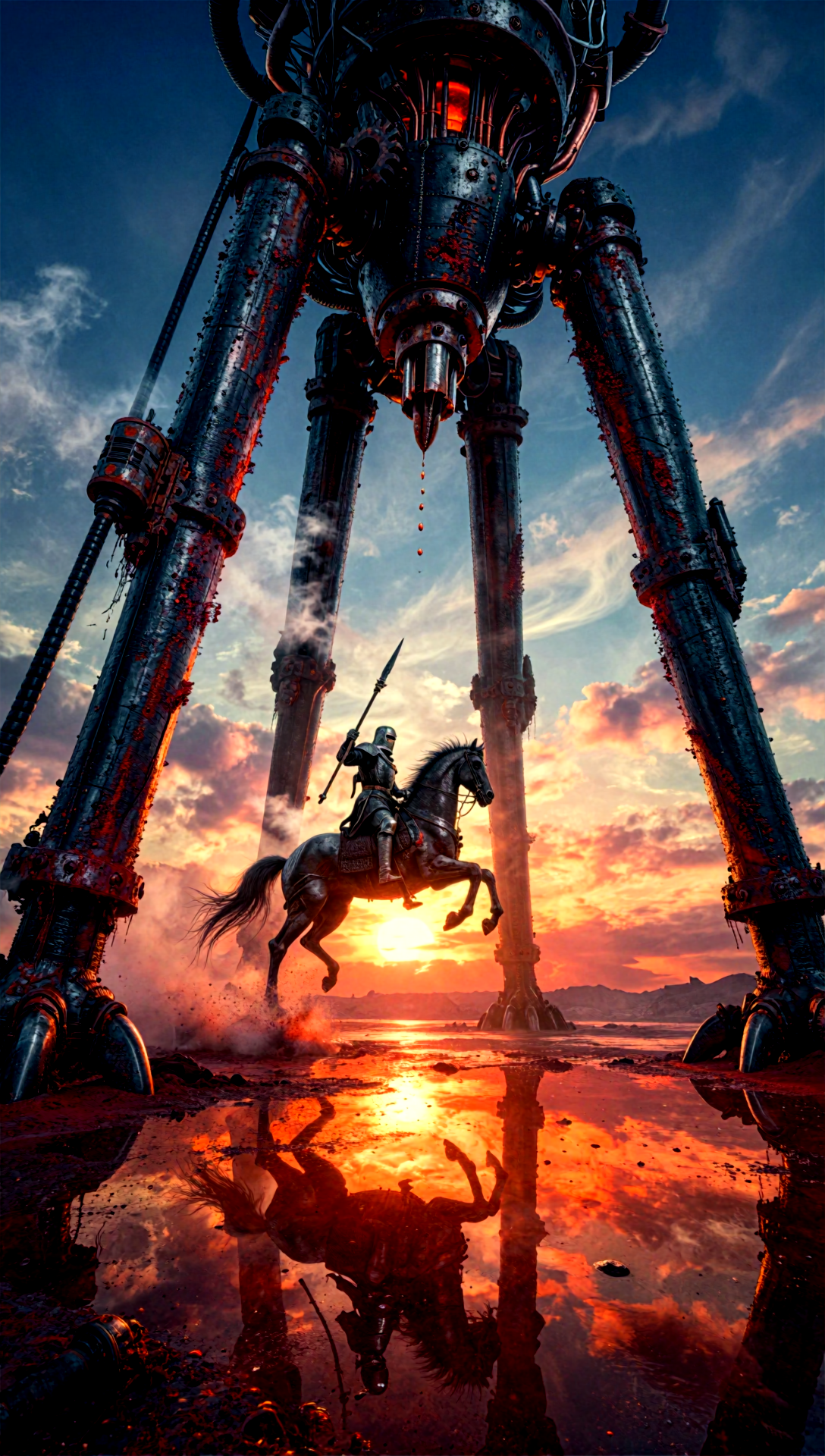 不可能的外星巨型结构、在机械生物三足架下流淌的血红色河流、中世纪骑士面对UFO、在黄昏天空中漂浮的发光方程式、火山神光倒映在黑曜石湖泊中,等等。发挥你的想象力。