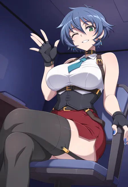 服装1(夹克):shijimasatomijacket,耳环,蓝色指甲,露指手套,红色短款夹克,胸下,红色裙子,侧开叉,黑色过膝袜,颈圈,白色衬衫,蓝色领带,腰带,吊袜带,黑色鞋履,高跟鞋