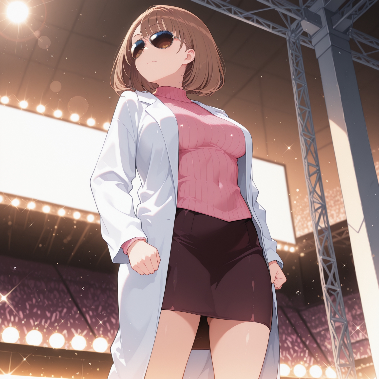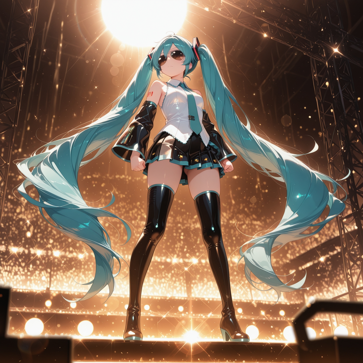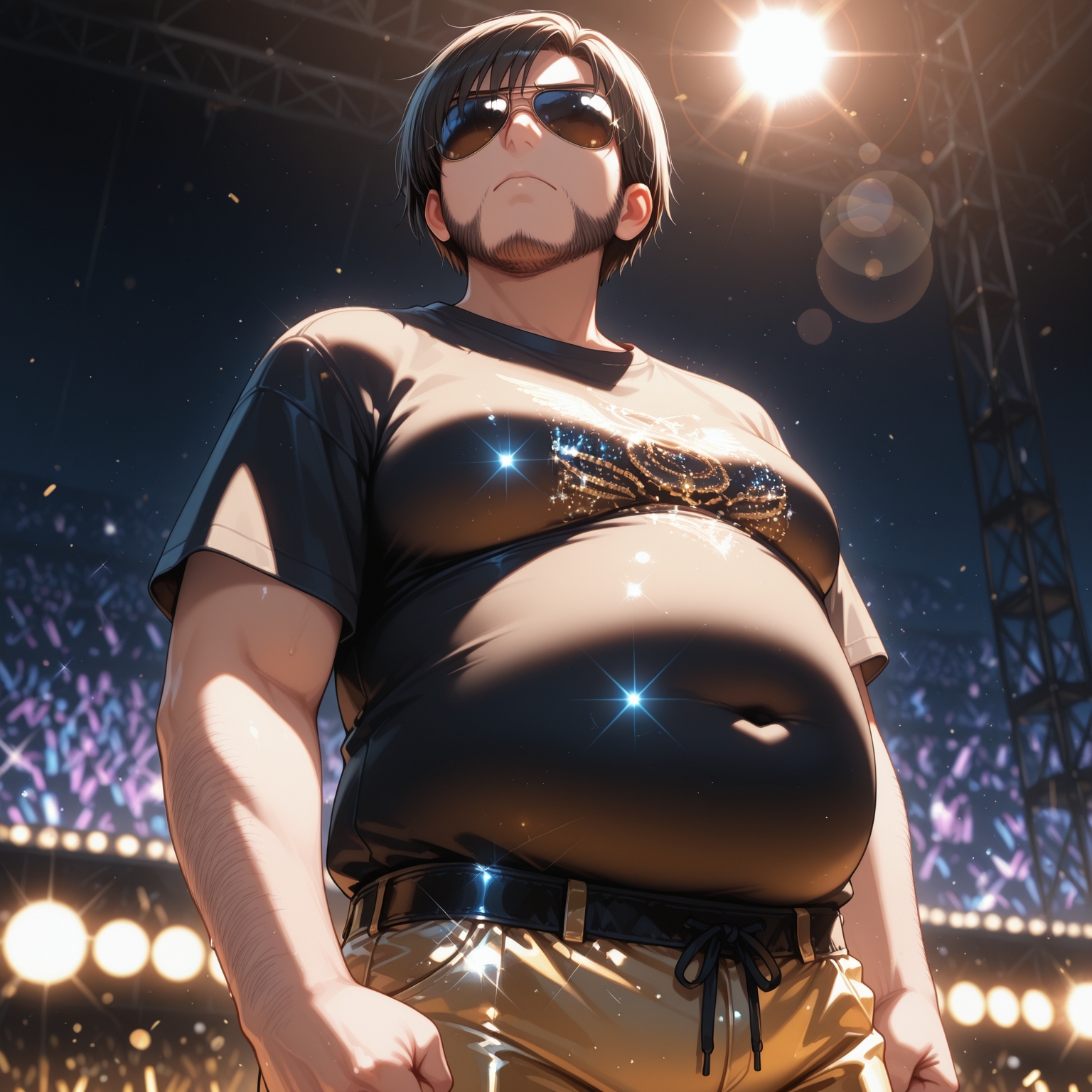 mj-standing still,>:\,apart legs,looking up,looking away,facing to the side,aviator sunglasses,standing,stadium,stage,glitter,spot light,depth of field,lens flare