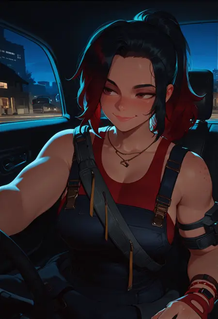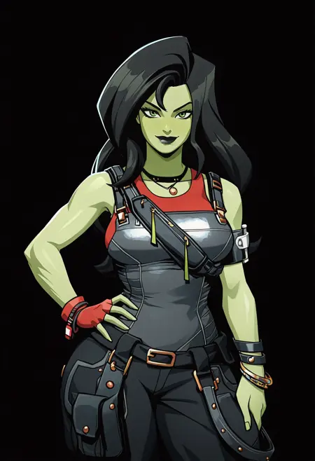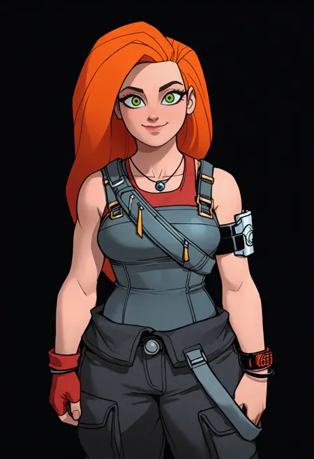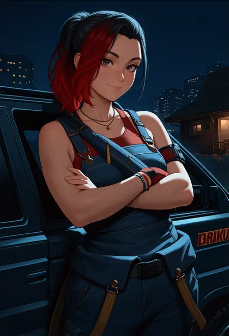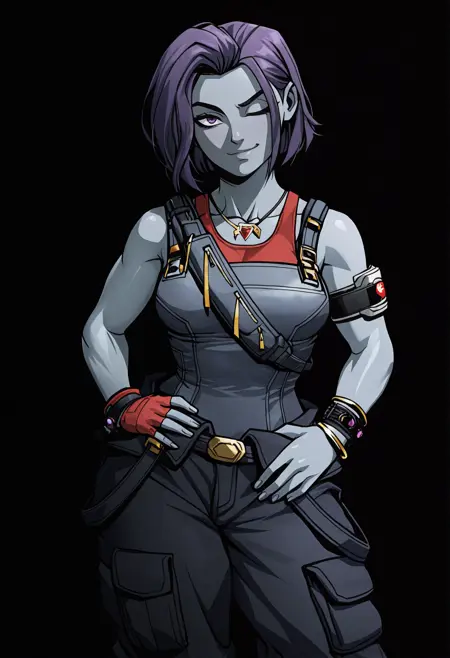 복장 #1: 목걸이, 팔찌, 팔밴드, 크로스바디 백, 허리 가방, 총알 방탄조끼, 회색 조끼, 작업복, 빨간 탱크탑, 빨간 장갑, 한 손가락만 벌린 장갑, 카고 팬츠, 검은 팬츠, 스니커즈