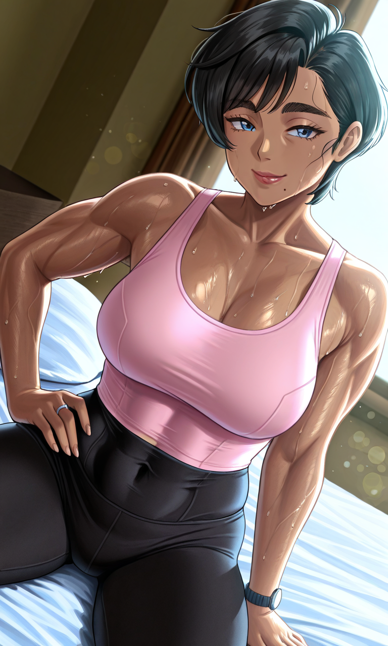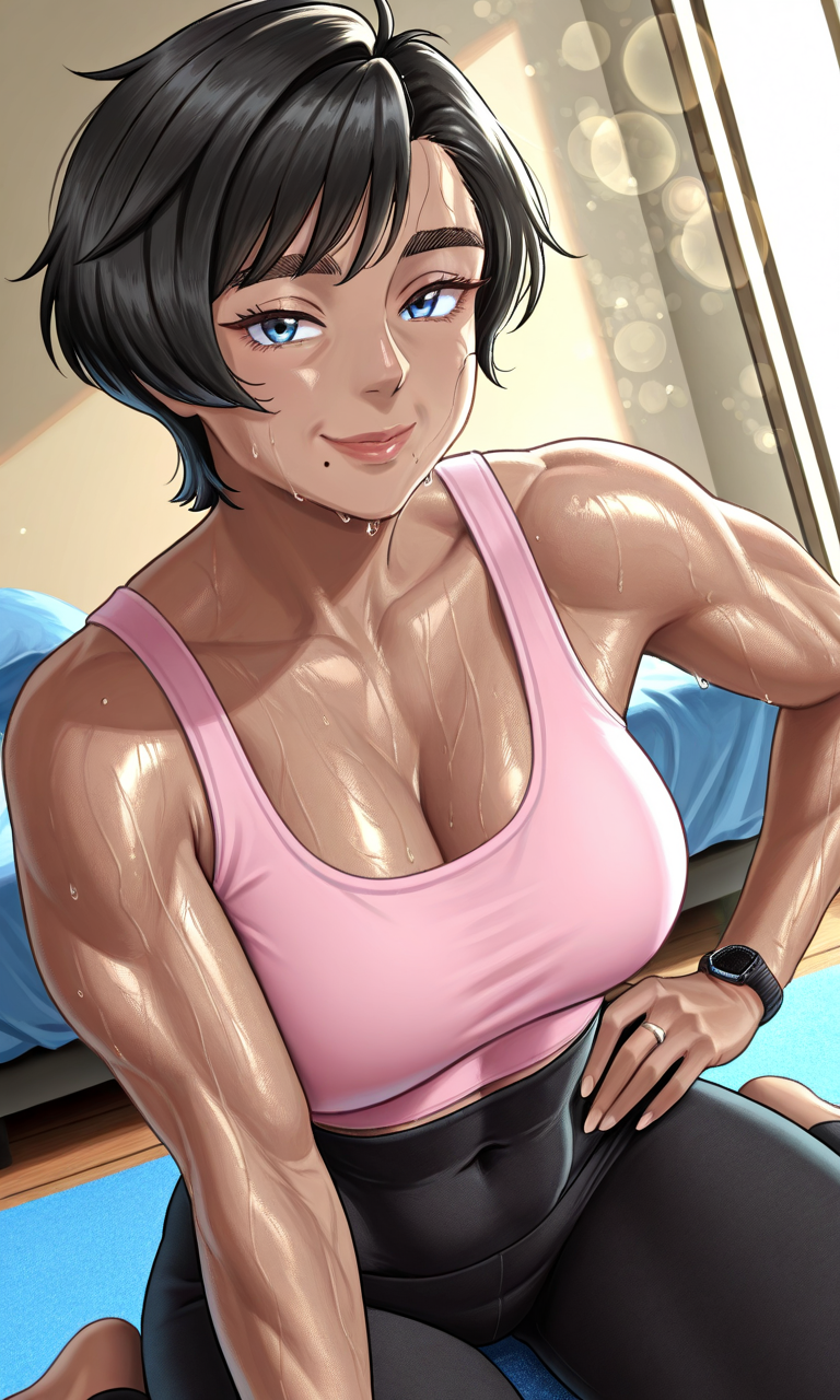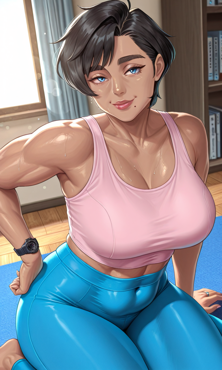 1woman, wrinkles, mature female, laurark, black hair, short hair, blue eyes, thick eyebrows, mole under mouth, mole, dark skin, dark-skinned female, tomboy, curvy, plump, muscular female, lips, wristwatch, yoga pants, pants, tank top, covered navel, ring, sports bra, pink sports bra,