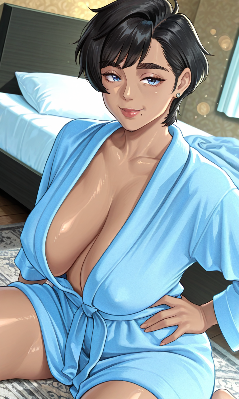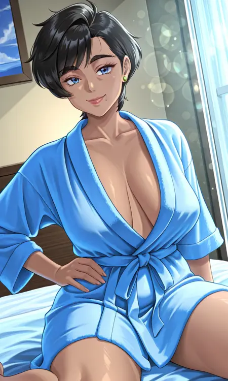 1woman, wrinkles, mature female, black hair, short hair, blue eyes, thick eyebrows, mole under mouth, mole, dark skin, dark-skinned female, tomboy, curvy, plump, lips, earrings, robe, bathrobe,