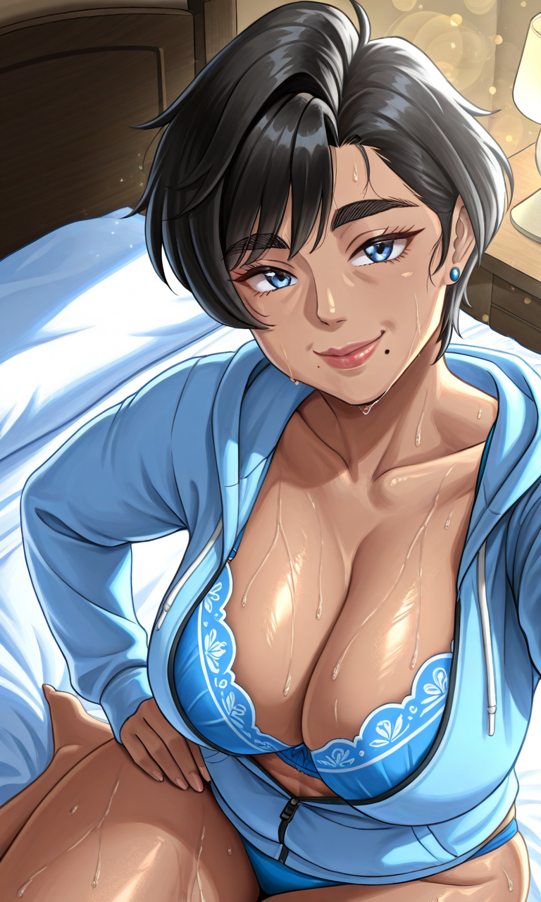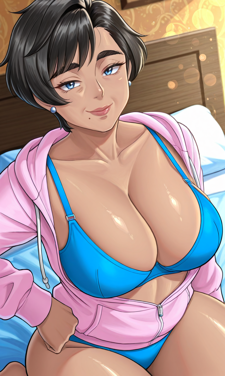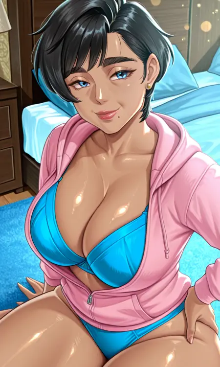 1woman, wrinkles, mature female, laurark, black hair, short hair, blue eyes, thick eyebrows, mole under mouth, mole, dark skin, dark-skinned female, tomboy, hoodie,  hood, hood down, pink jacket, blue bra,  blue panties,  underwear, cleavage, large breasts, earrings,