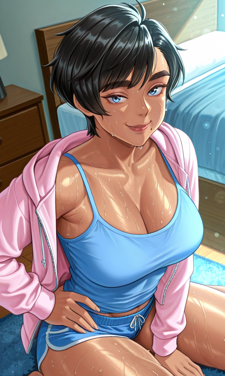 1woman, wrinkles, mature female, laurark, black hair, short hair, blue eyes, thick eyebrows, mole under mouth, mole, dark skin, dark-skinned female, tomboy, hoodie,  hood, hood down, pink jacket, open jacket, blue camisole, camisole, short shorts,
