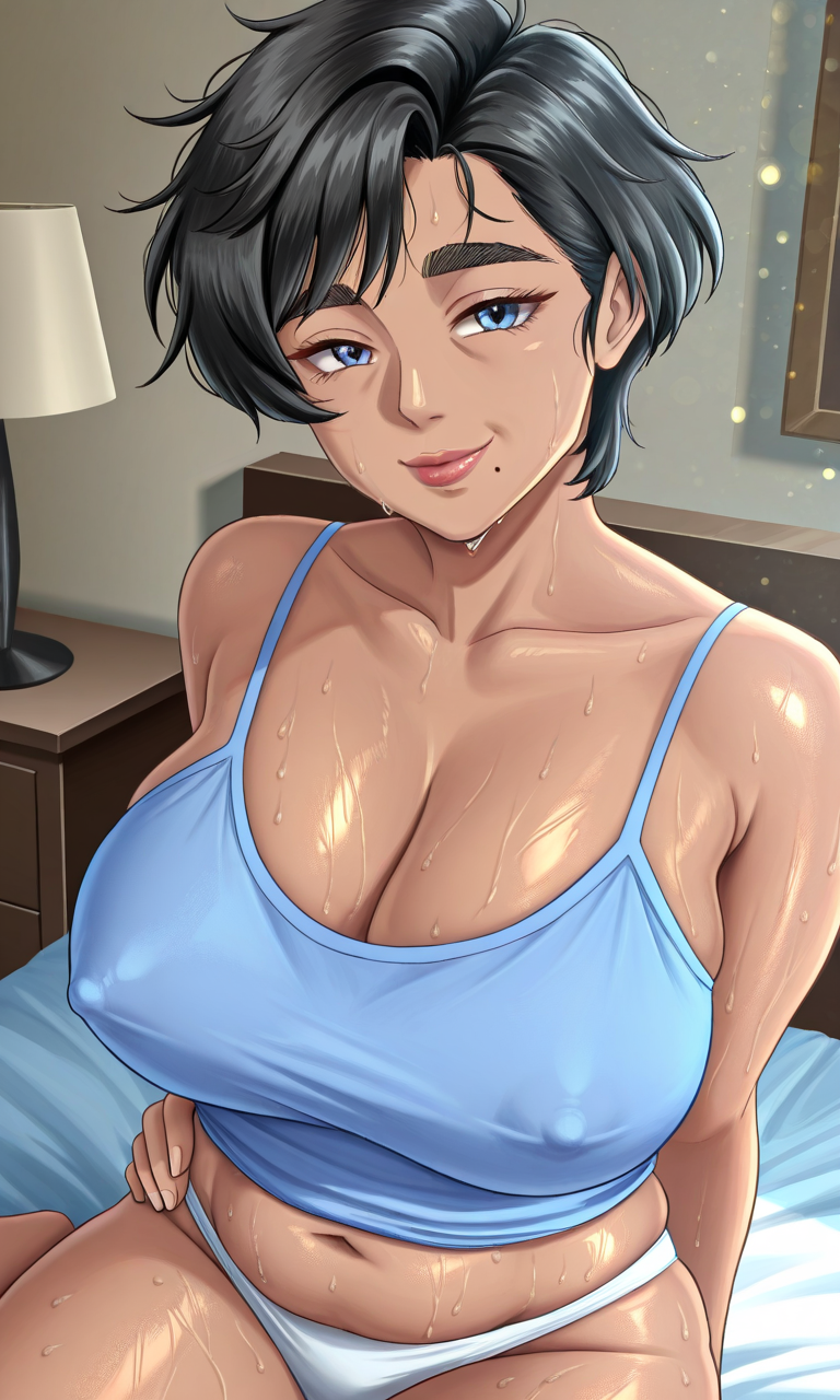 1woman, wrinkles, mature female, black hair, short hair, blue eyes, thick eyebrows, mole under mouth, mole, dark skin, dark-skinned female, tomboy, curvy, plump, messy hair, tank top, blue camisole, camisole, collarbone, navel, cleavage, large breast, covered nipples, white panties,  underwear, panties, sweaty, steamed body,