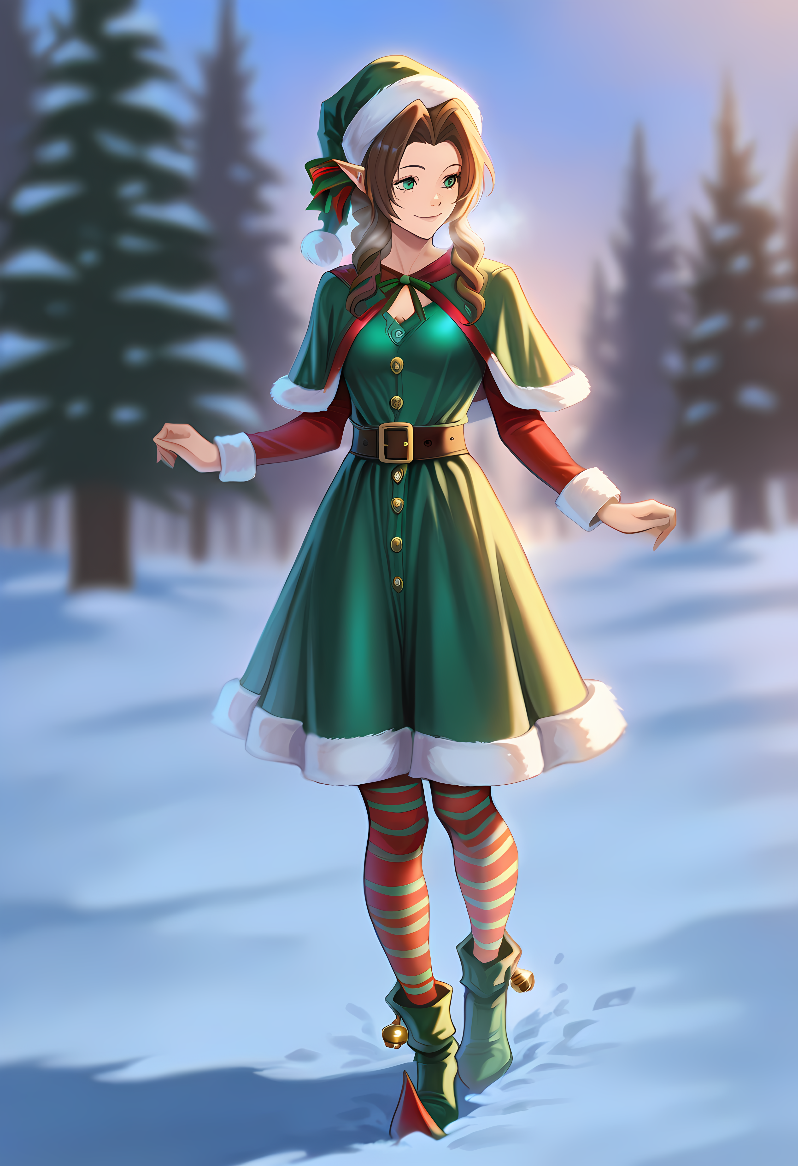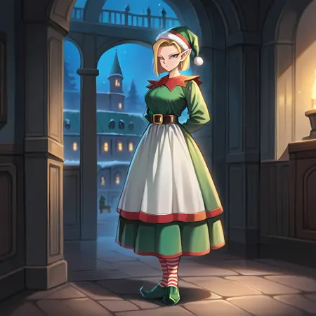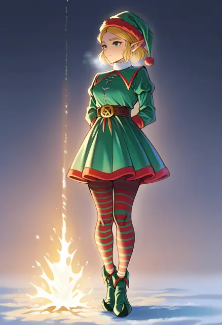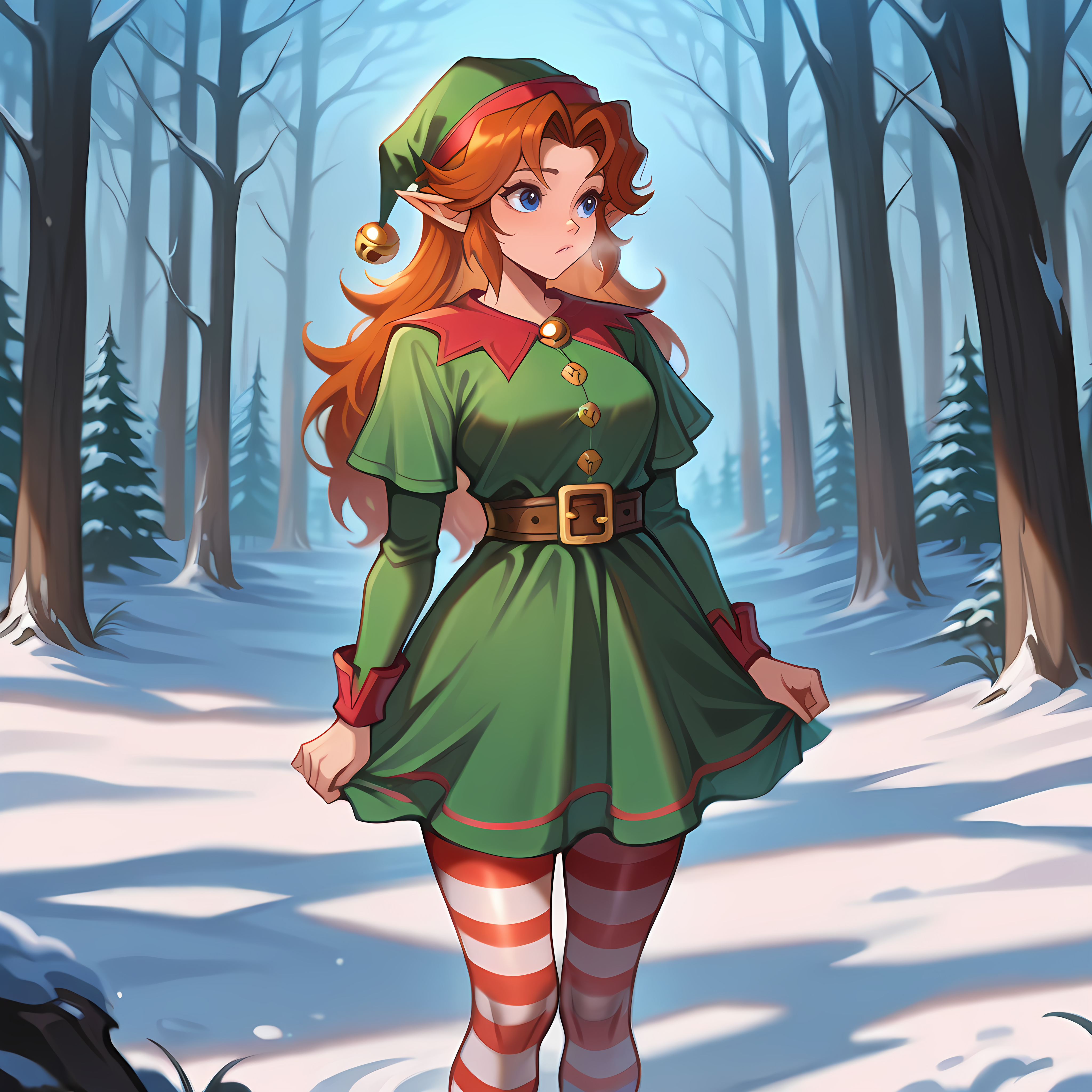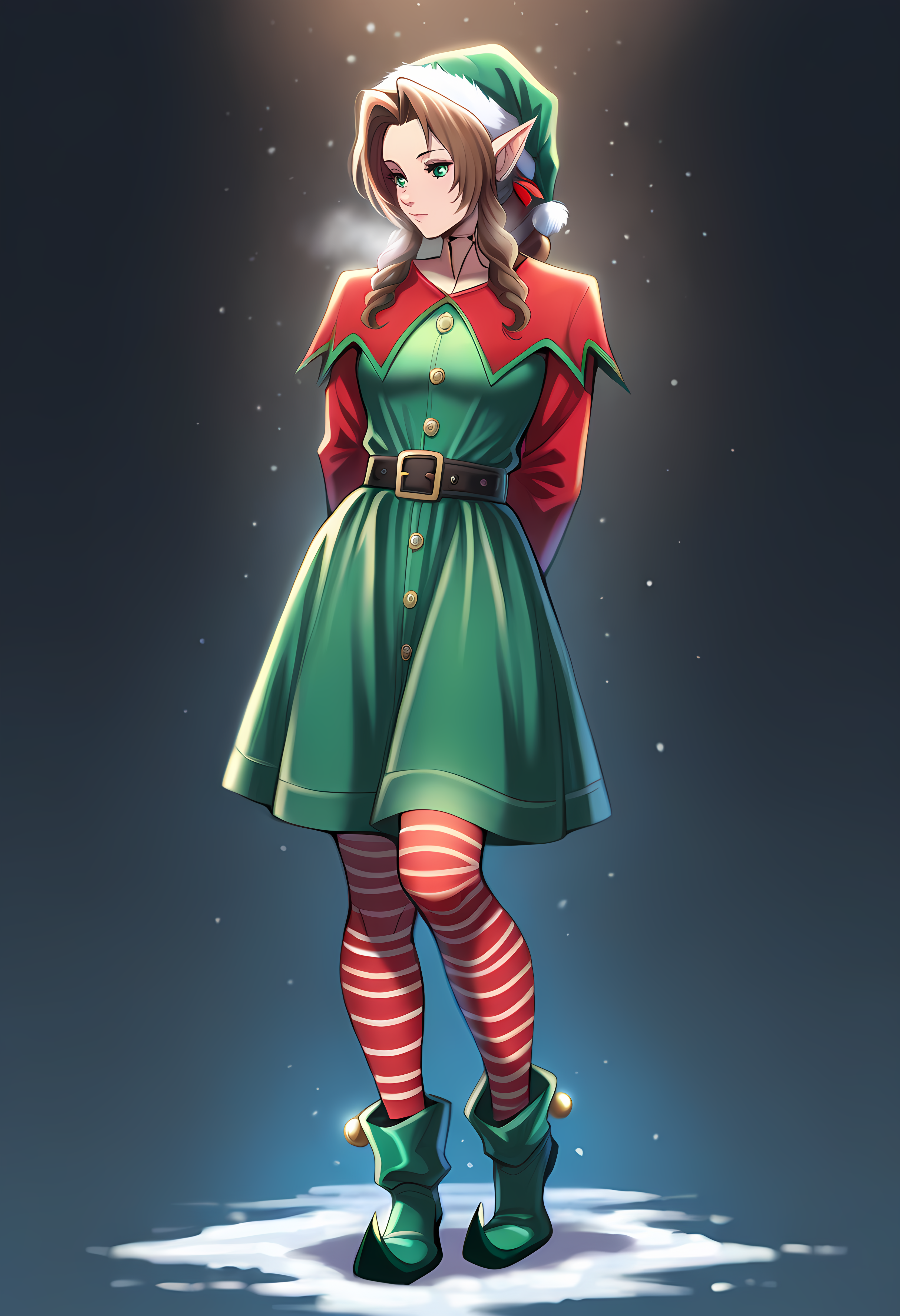 추가: 뾰족한 귀, 줄무늬 팬티스타킹, 녹색 드레스, 빨간 테두리, 벨트, 녹색 신발, 뾰족한 신발, 녹색 모자, 산타 모자
