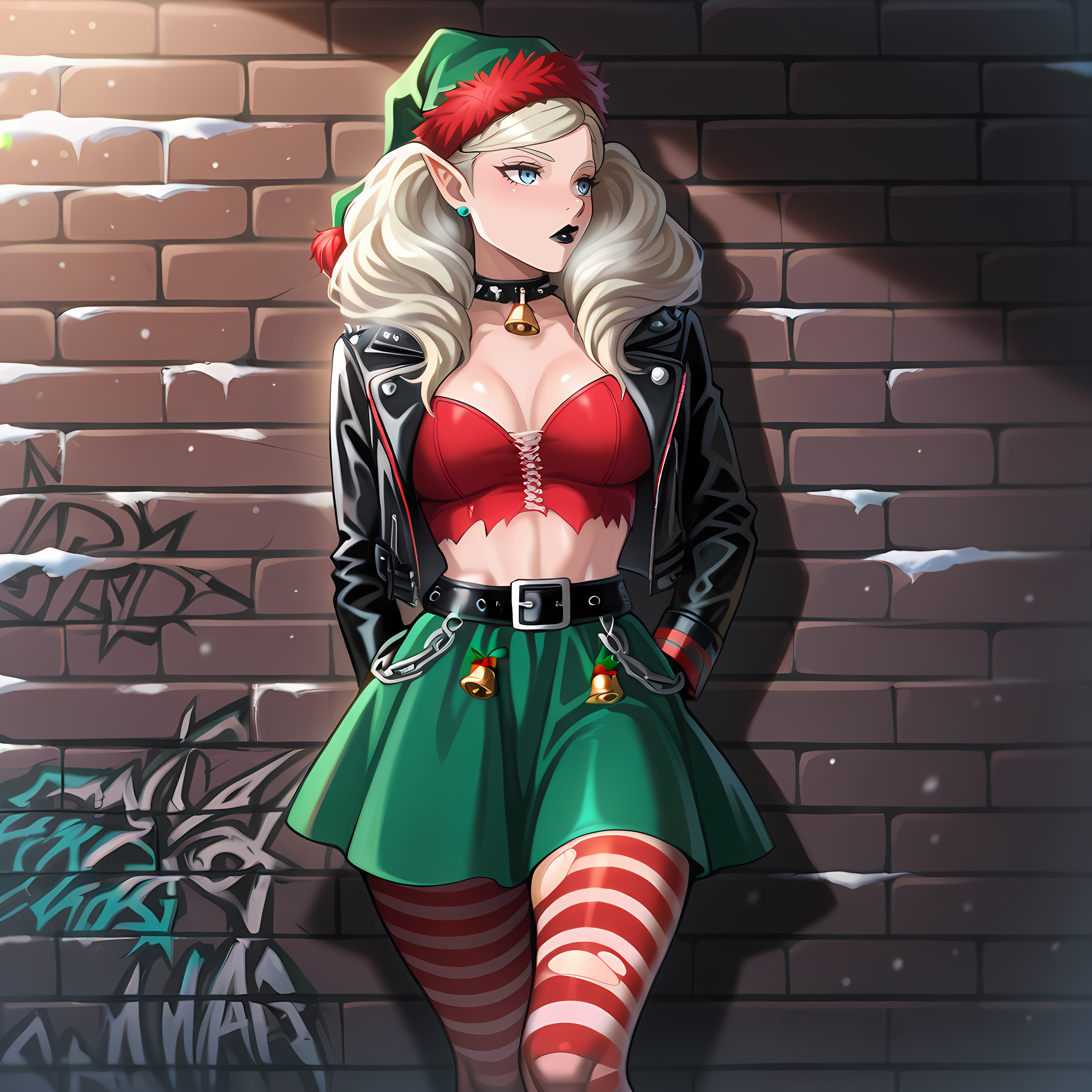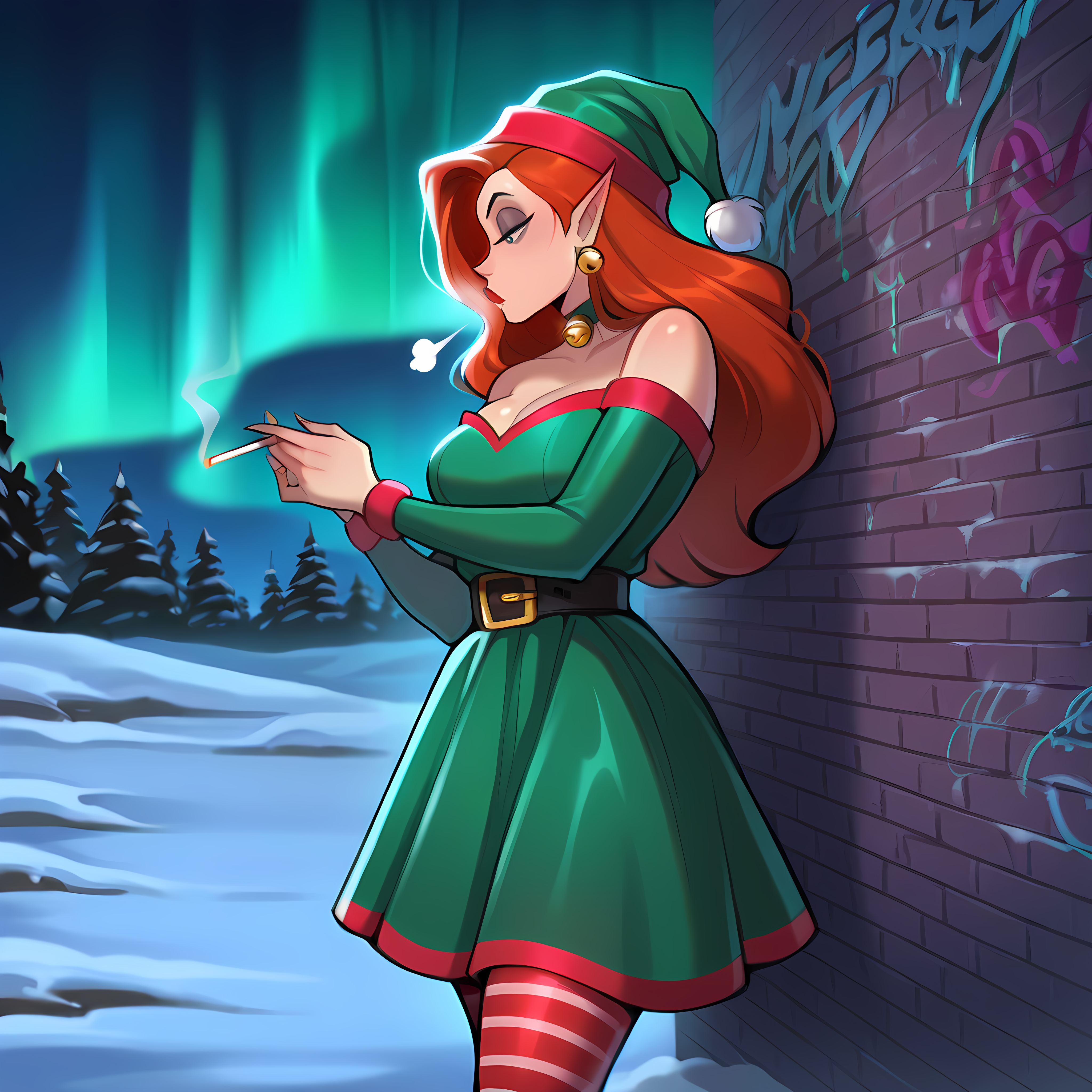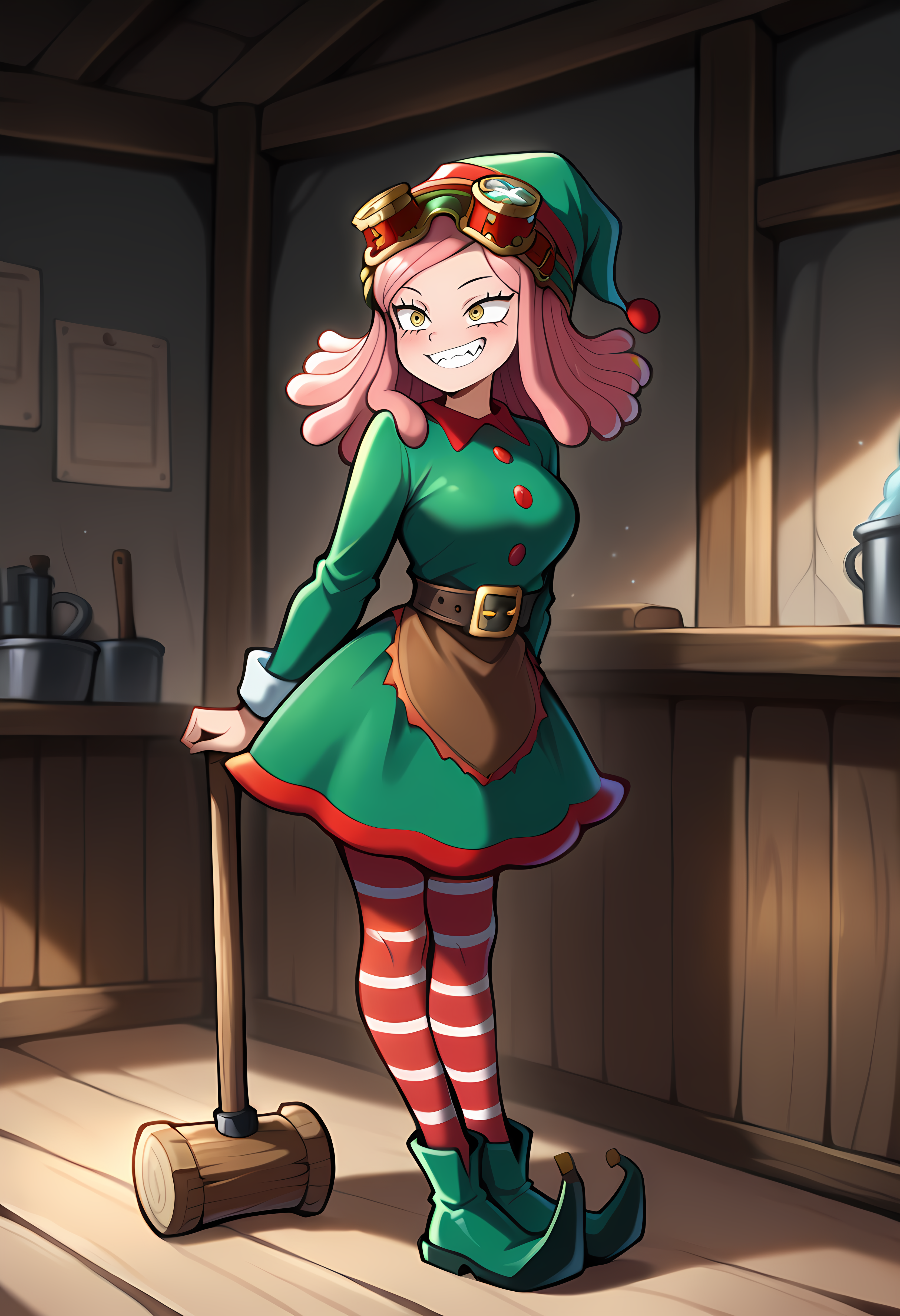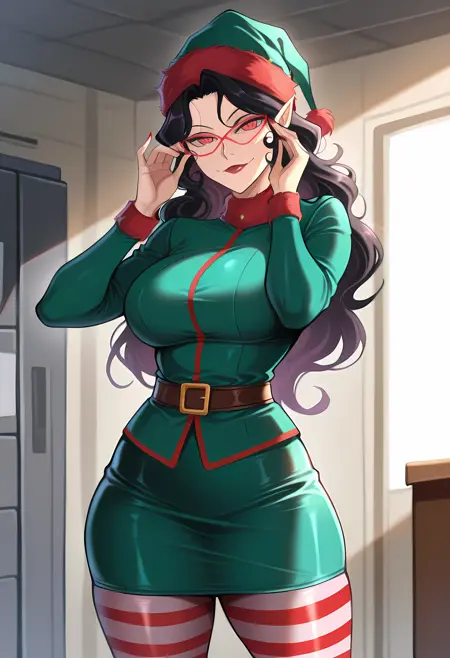 추가: 뾰족한 귀, 줄무늬 팬티스타킹, 녹색 드레스, 빨간 테두리, 벨트, 녹색 신발, 뾰족한 신발, 녹색 모자, 산타 모자