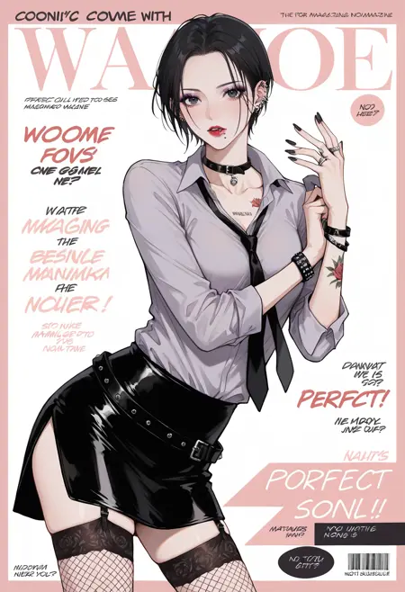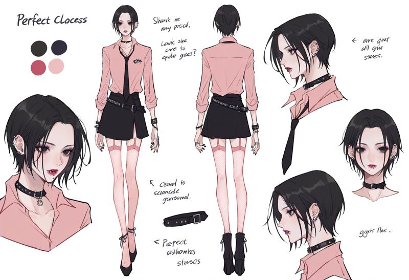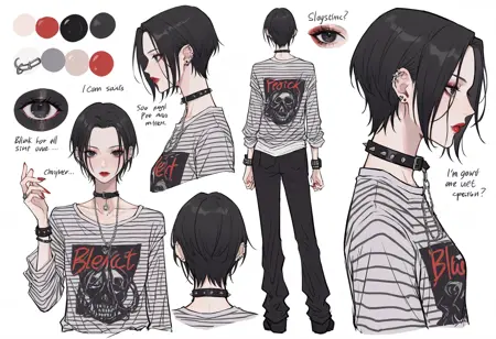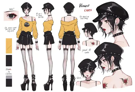 허벅지까지 오는 양말, 모자, 플랫폼 신발, 게터 스트랩, 하이힐, 피시넷, 치마, 보석, 칼라, 네일 폴리시, 문신, 스파이크 칼라, 귀걸이, 벨트, 피시넷 허벅지 양말, 플랫폼 힐, 스파이크, 초커, 가슴, 검은 허벅지 양말, 미니스커트, 신발, 어깨 노출, 반바지, 어깨 노출, 팔찌, 캐브리 모자, 고딕, 검은 치마, 검은 네일, 빨간 네일, 검은 머리장식