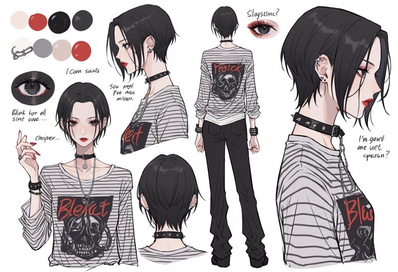 입술, 보석, 피어싱, 칼라, 귀걸이, 체인, 네일 폴리시, 귀 피어싱, 초커, 팔찌, 목걸이, 스파이크, 줄무늬, 셔츠, 티셔츠, 고딕, 줄무늬 셔츠, 빨간 네일, 옷에 쓰인 글자, 스파이크 칼라