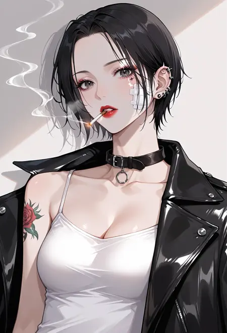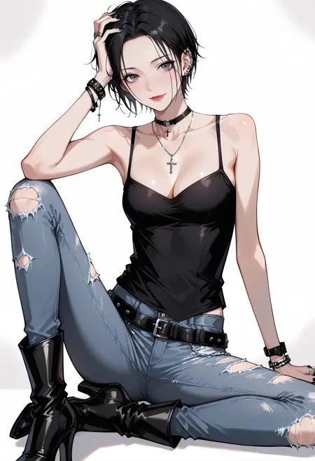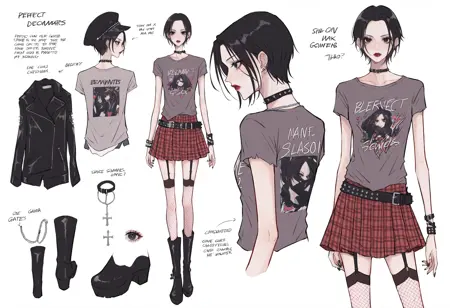 부츠, 허벅지까지 오는 양말, 치마, 고딕, 피시넷, 보석, 재킷, 패션, 체크 무늬 치마, 게터 스트랩, 체크, 팔찌, 벨트, 셔츠, 재킷 벗음, 가죽 재킷, 가죽, 초커, 게터 벨트, 티셔츠, 칼라, 스파이크, 네일 폴리시, 스파이크 벨트, 옷에 쓰인 글자, 미니스커트, 피시넷 허벅지 양말, 모자, 십자가