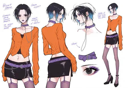 파란 머리, 다채로운 머리, 보라색 입술, 허벅지까지 오는 양말, 치마, 배꼽 피어싱, 피어싱, 복부 노출, 게터 스트랩, 체인, 미니스커트, 목걸이, 가슴, 초커, 벨트, 연필 스커트, 보석, 고딕, 손목을 넘는 소매, 절대 영역, 긴 소매, 귀걸이, 중간 크기 가슴, 셔츠, 검은 치마, 주황색 셔츠, 보라색 허벅지 양말